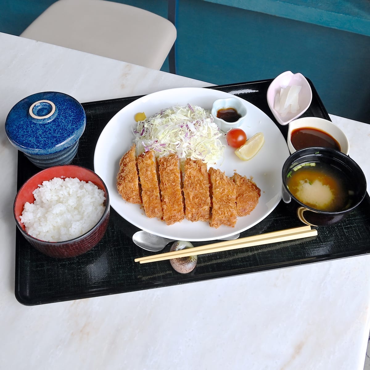 「ロースかつ膳」を注文すると、ごはん、味噌汁、香の物、茶碗蒸しがついてきます。