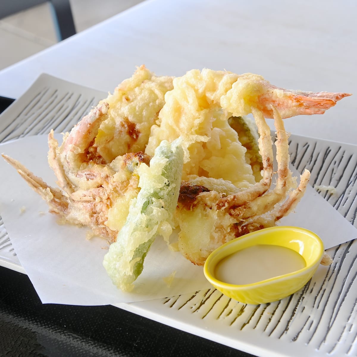 揚げたての天麩羅は、ソフトシェルクラブ、エビ、カボチャ、鶏、シシトウ☆
