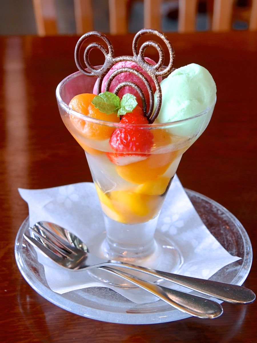 ミッキーモチーフの「フルーツとわらび餅のパフェ、和三盆のシロップ」☆