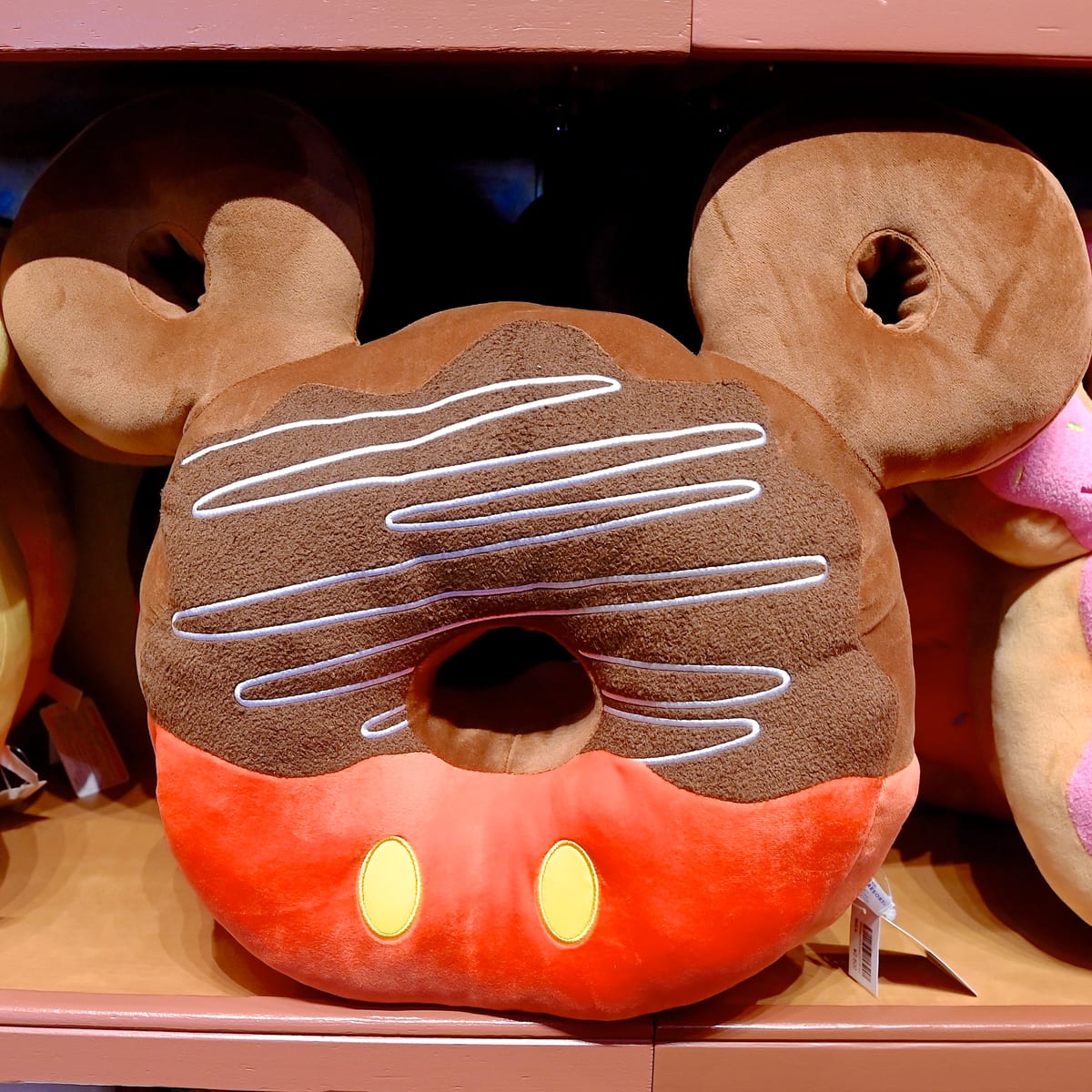 ドーナツ風のお耳、赤いパンツ、シュガーとチョコレートコーティングがたっぷりかかったミッキーモチーフのドーナツクッションです。