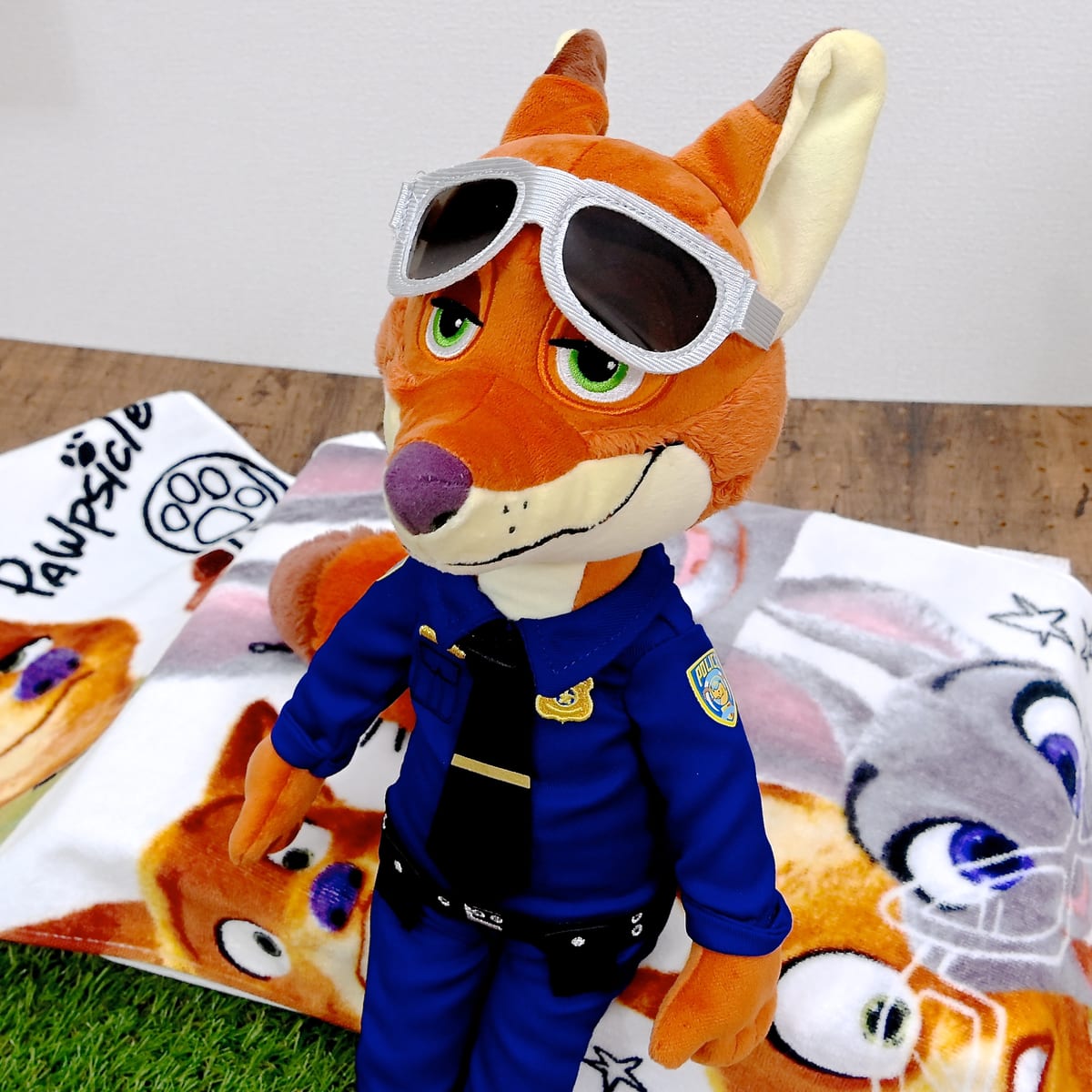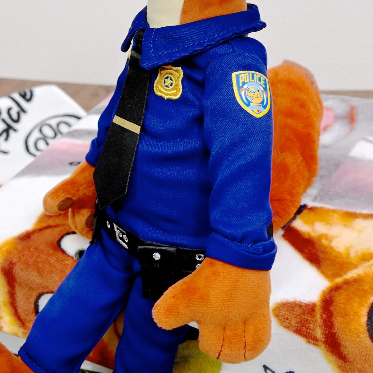 警官服を着たニック・ワイルドのぬいぐるみ。