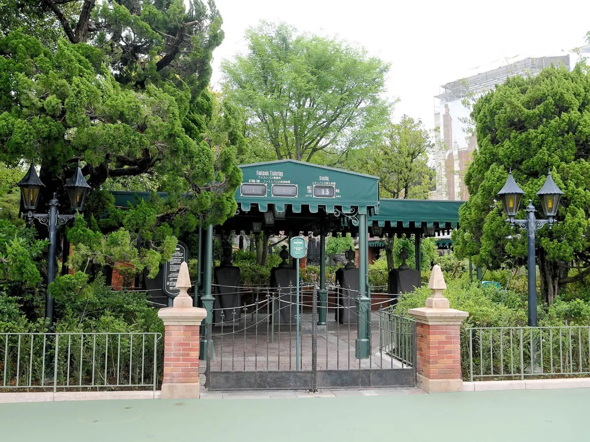 お墓が並ぶホーンテッドマンションならではの石造りのファストパス発券機です。