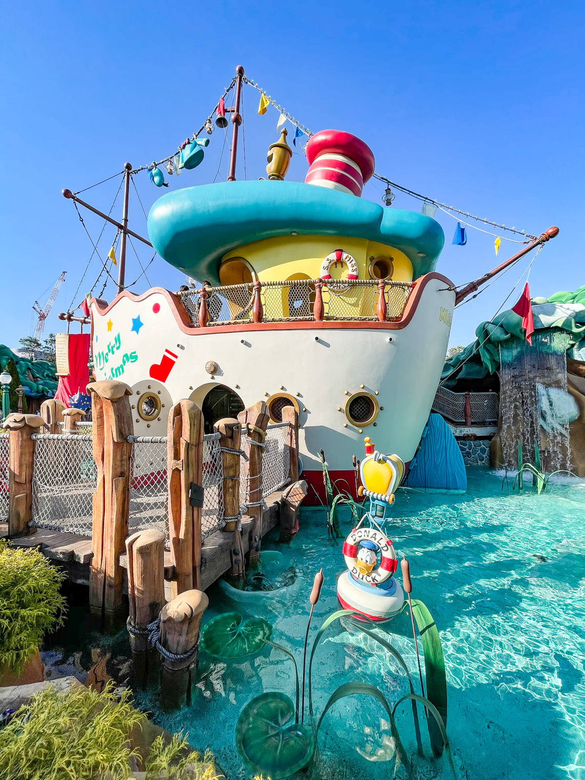 東京ディズニーランド/トゥーンタウンにあるアトラクション「ドナルドのボート」にある赤と白の浮き輪の中からお顔を出しているかわいい「ドナルドダック」