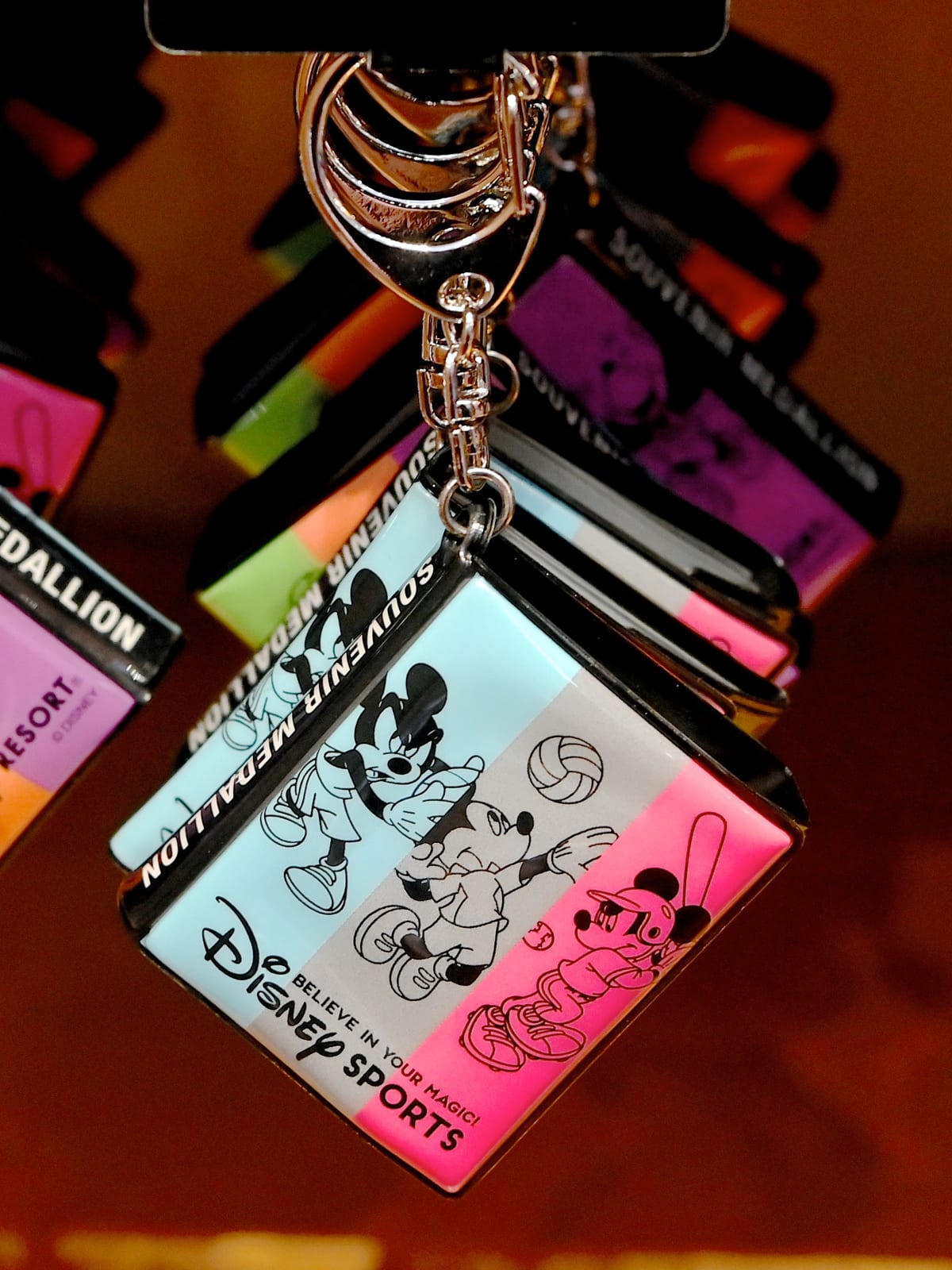 スポーツをするミッキーマウスがデザインされたスーベニアメダル入れ(8枚収納可能)。