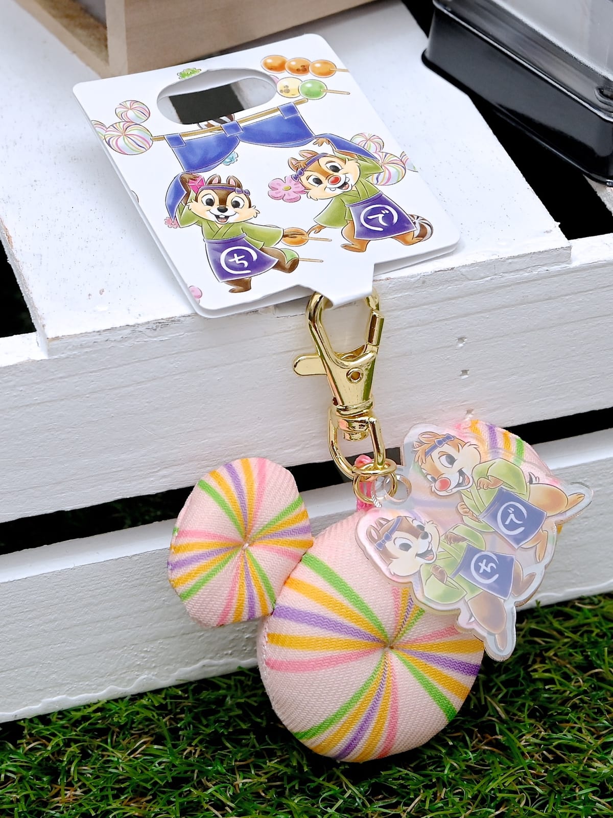 和菓子をイメージしたミッキーシェイプ、和菓子職人に扮したチップ&デールデザインのチャームが付いたクリーナー付きのキーホルダー。
