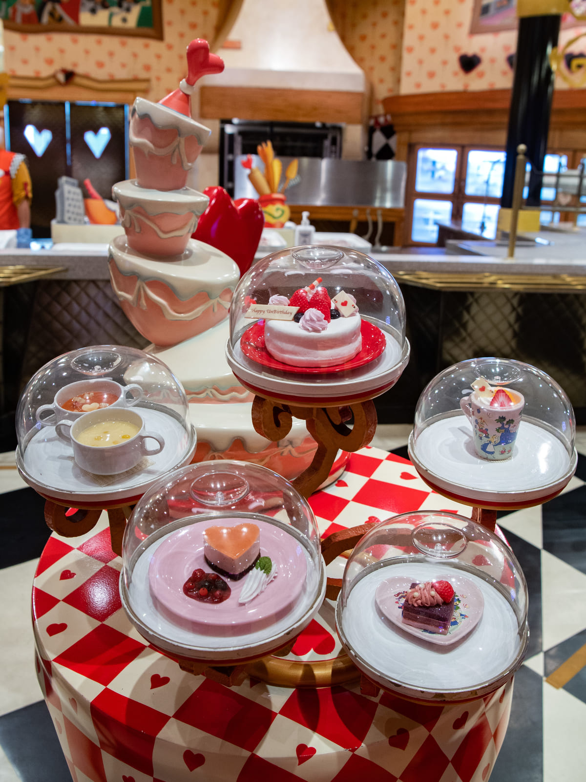「クイーン・オブ・ハートのバンケットホール」限定のスーベニア付きメニューや、ホールケーキなどここでしか提供されていないデザートメニュー。
