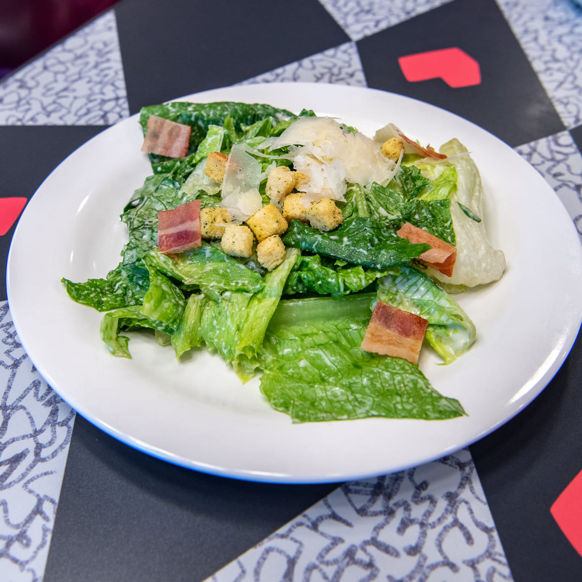 チーズとクルトンがたっぷりのシーザーサラダ。