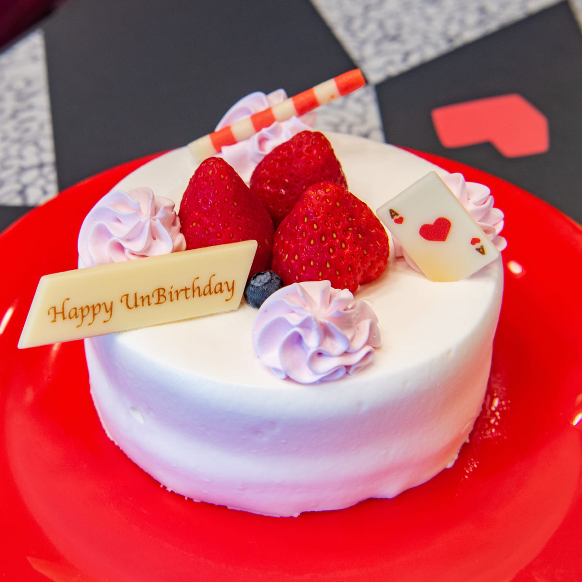 『ふしぎの国のアリス』らしく“Happy Unbirthday”(お誕生日じゃない日おめでとう)プレートが付いています。