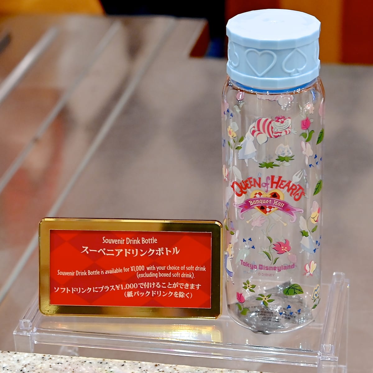 クイーン・オブ・ハートのバンケットホールのロゴ、アリス、チェシャ猫たちが総柄でデザインされたドリンクボトル。