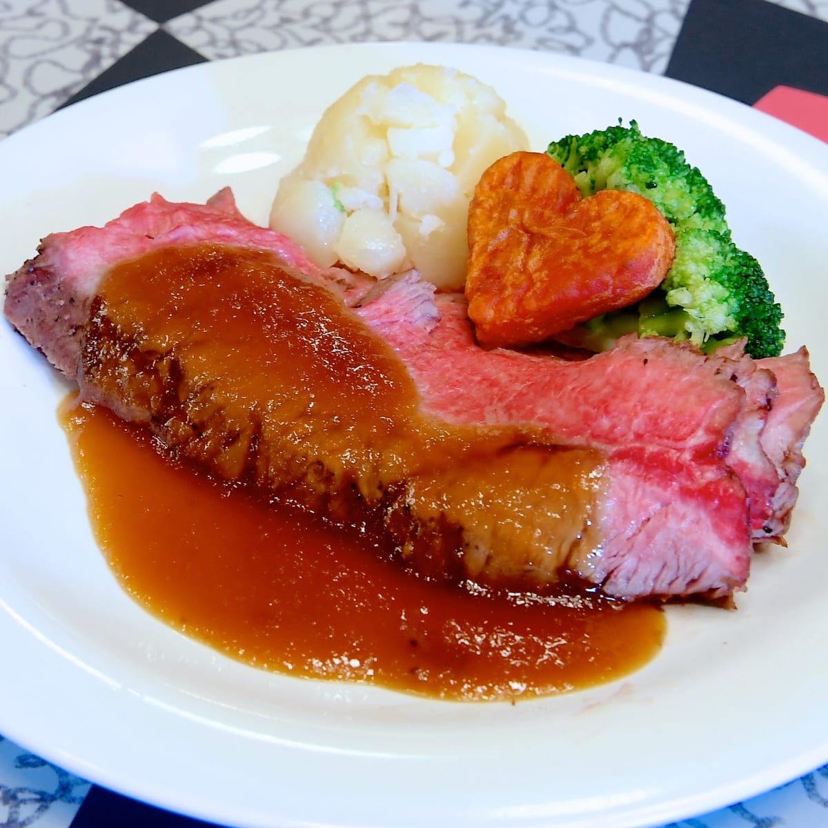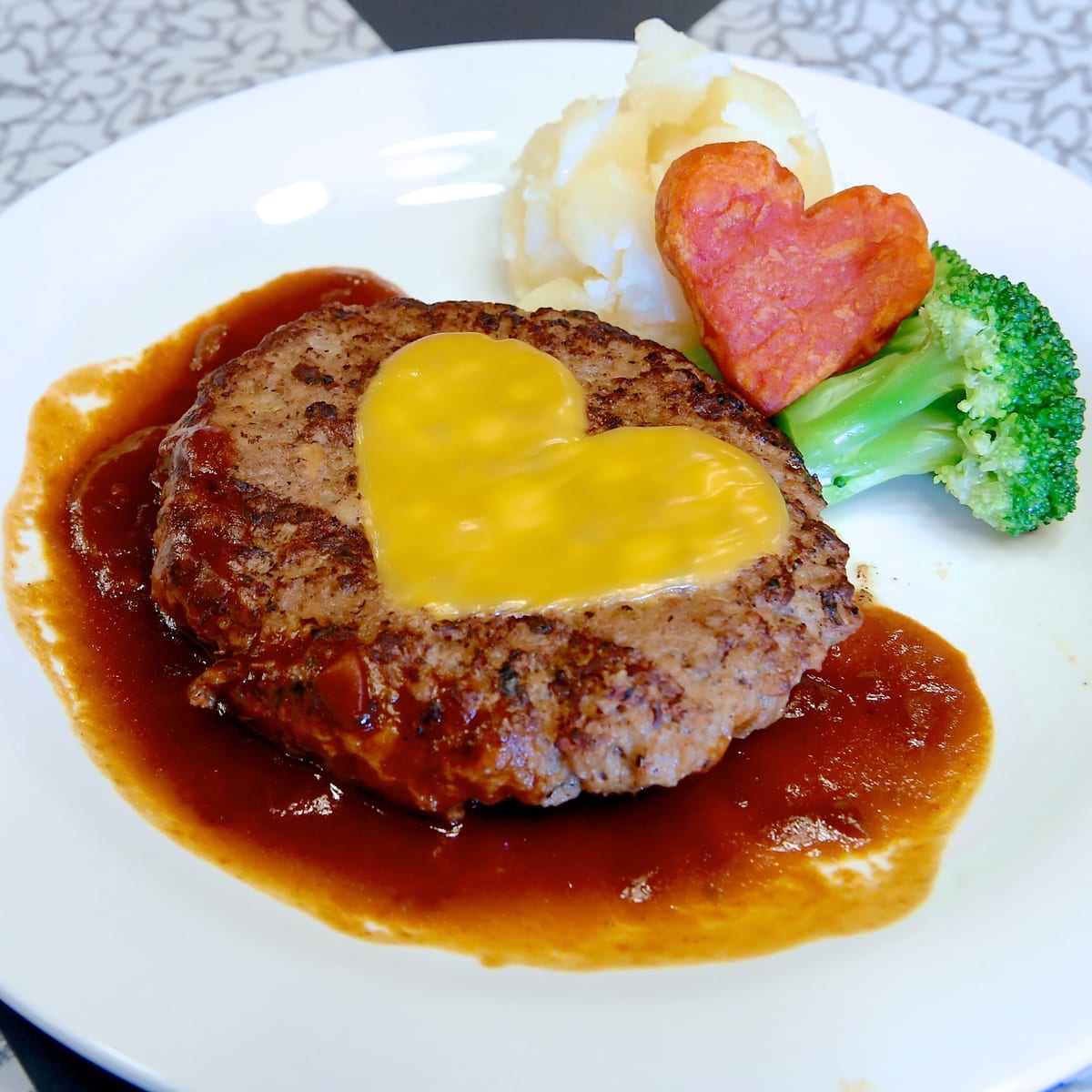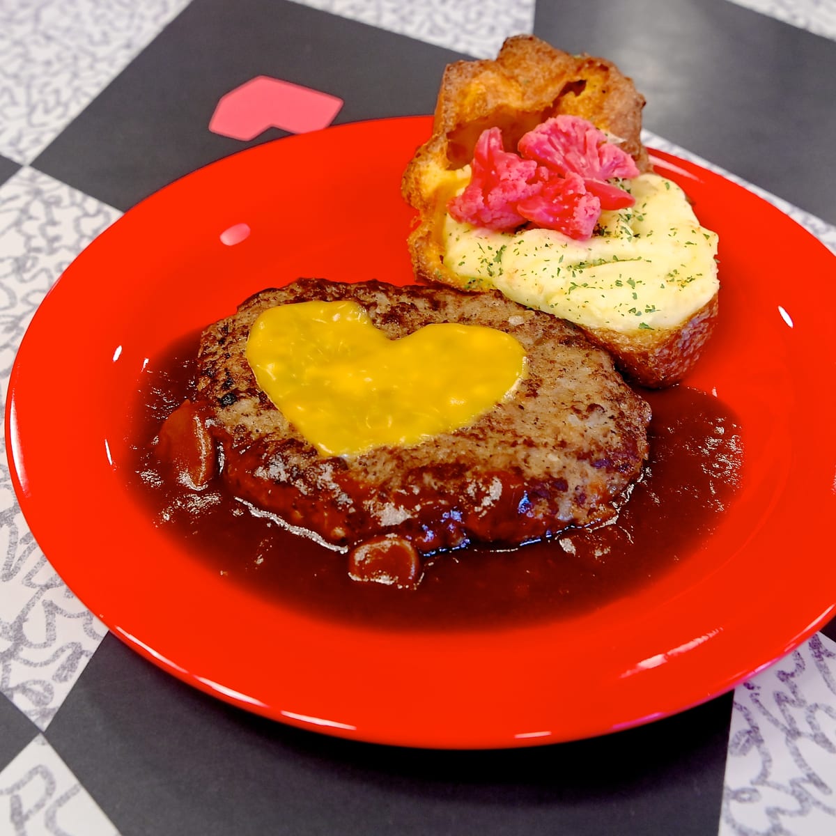 ハートの女王の晩餐会らしく、大きなハート型のチーズがトッピングされたなハンバーグ。