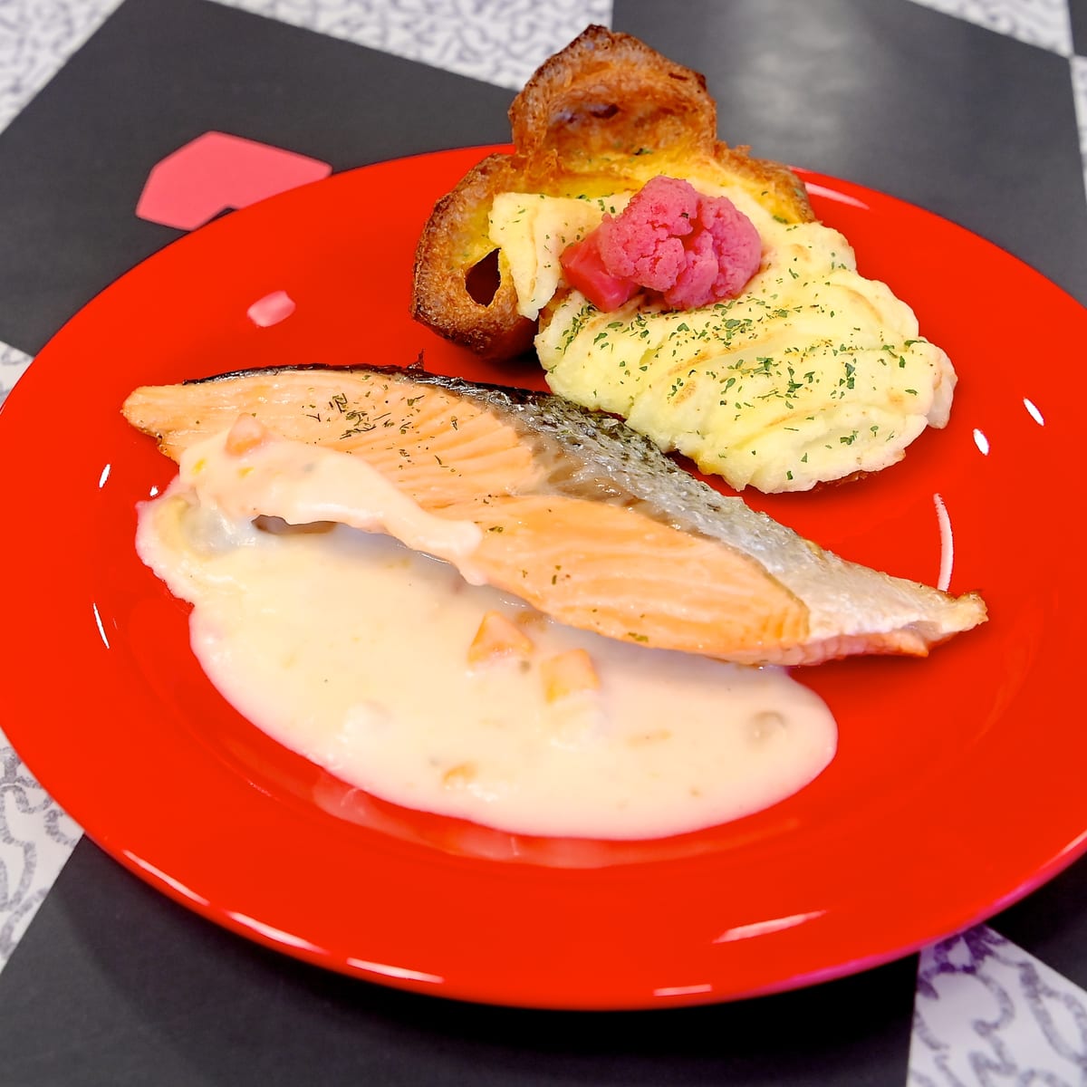 メインディッシュに“サーモンのオーブン焼き、シーフードクリームソース”が登場。