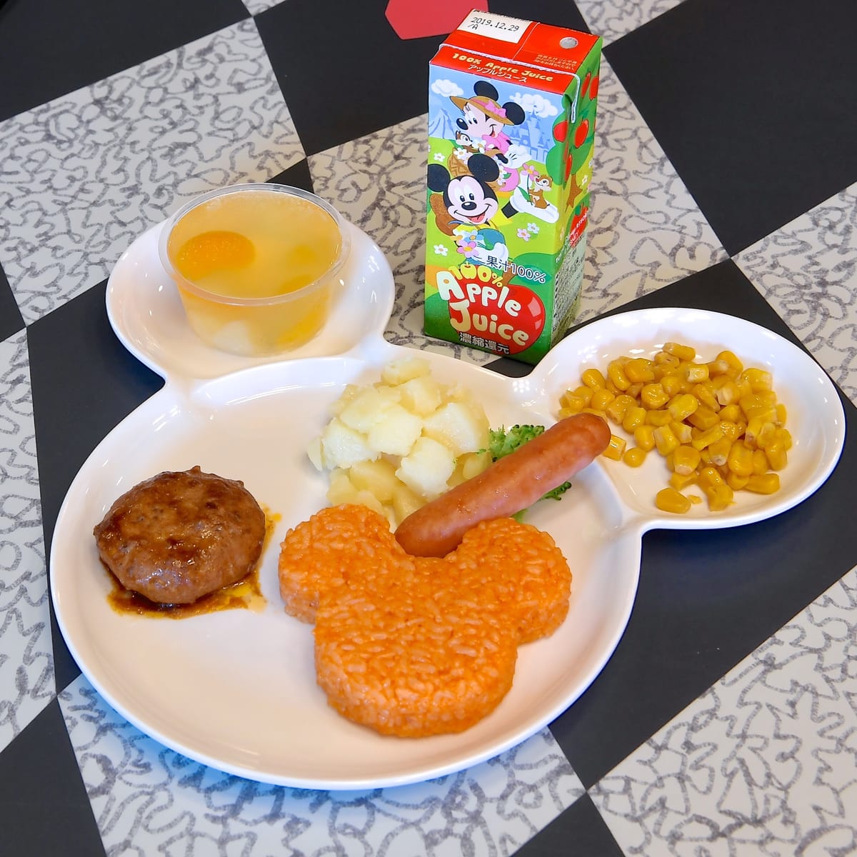 ハンバーグ、ケチャップおにぎり、ソーセージ、マッシュポテト、ブロッコリー、コーン、 フルーツゼリーのセット。