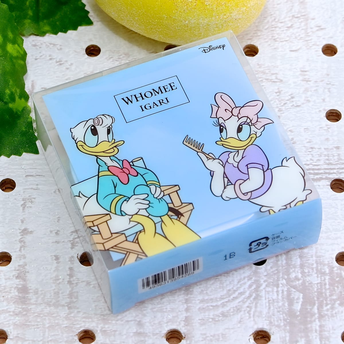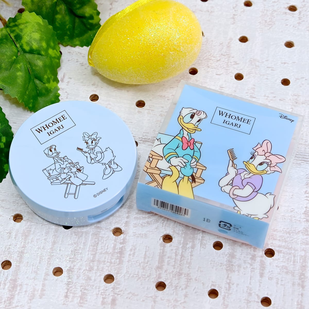 カーラーを巻いたキュートなドナルドとクシを持ってどんなスタイリングにするか考えているようなデイジーがデザインされたフェイスシャドウのパッケージ。