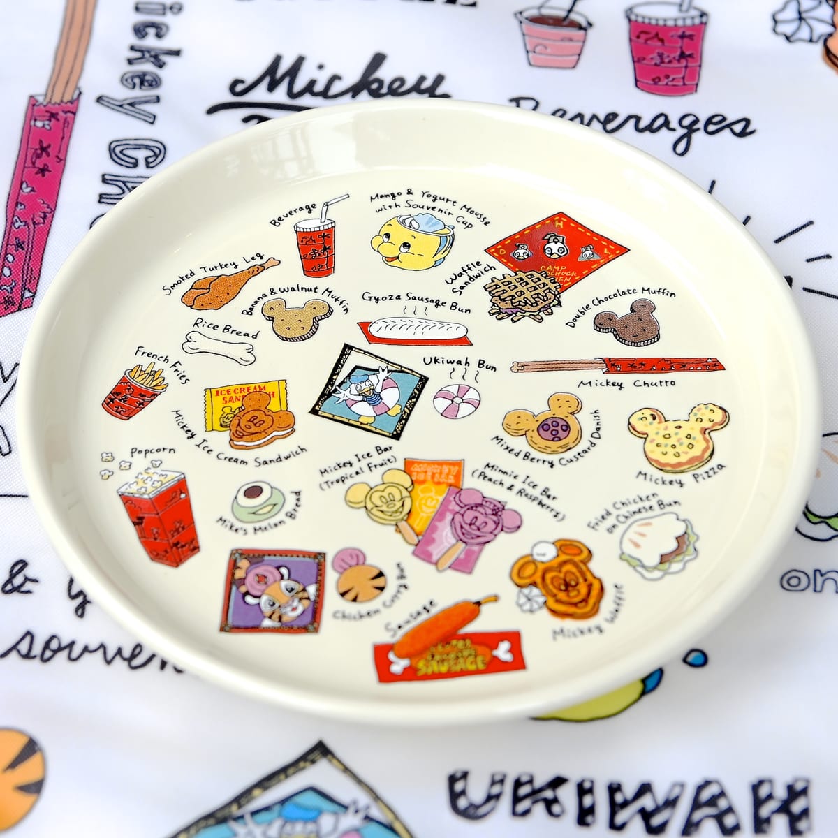 スーベニアプレートにはポップコーン、チュロス、チャンドゥのチキンカリーまん、マイクメロンパンなどパークフードが総柄でデザインされています。