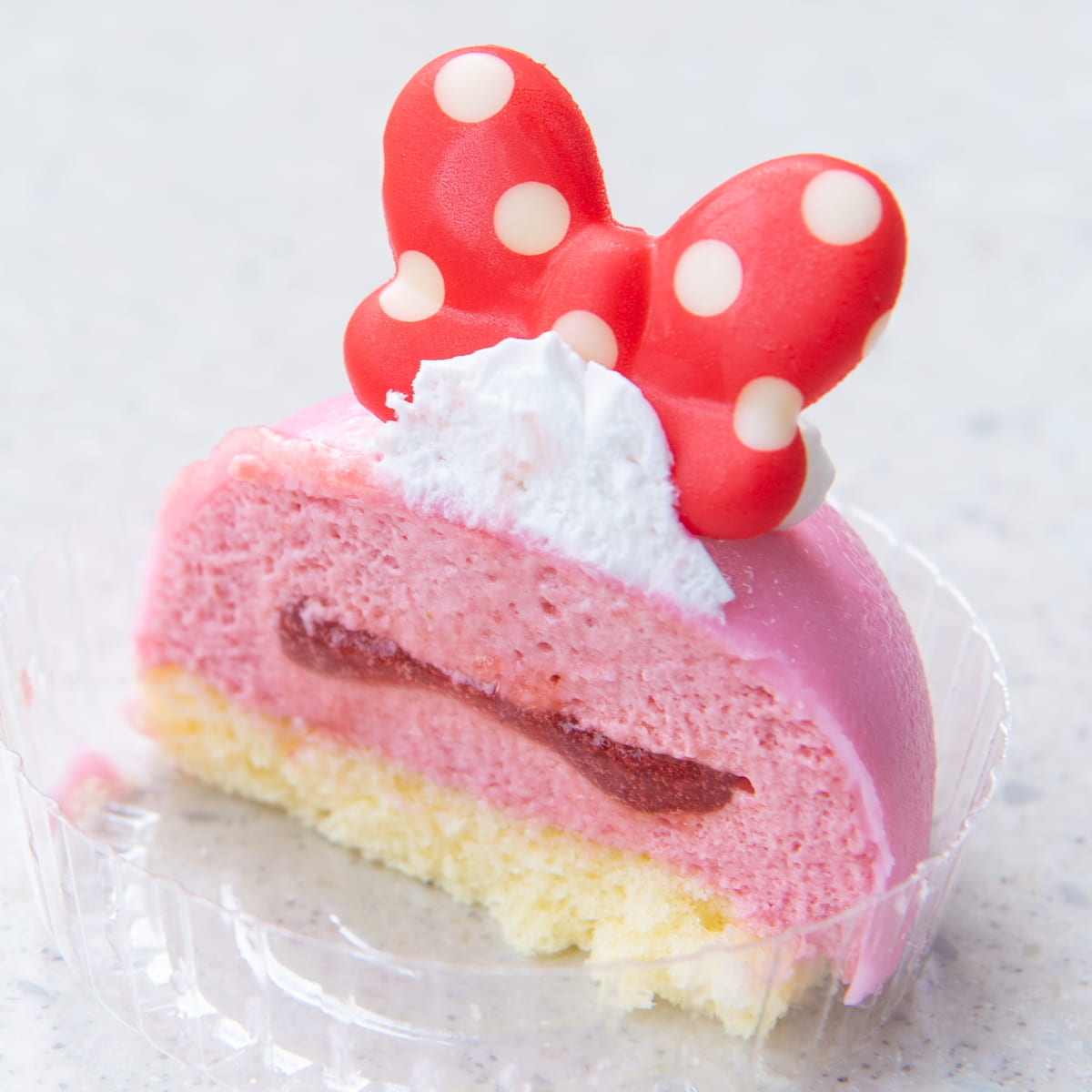 デザートはミニーマウスらしいドット柄のリボンチョコレート付きのストロベリームースケーキ☆