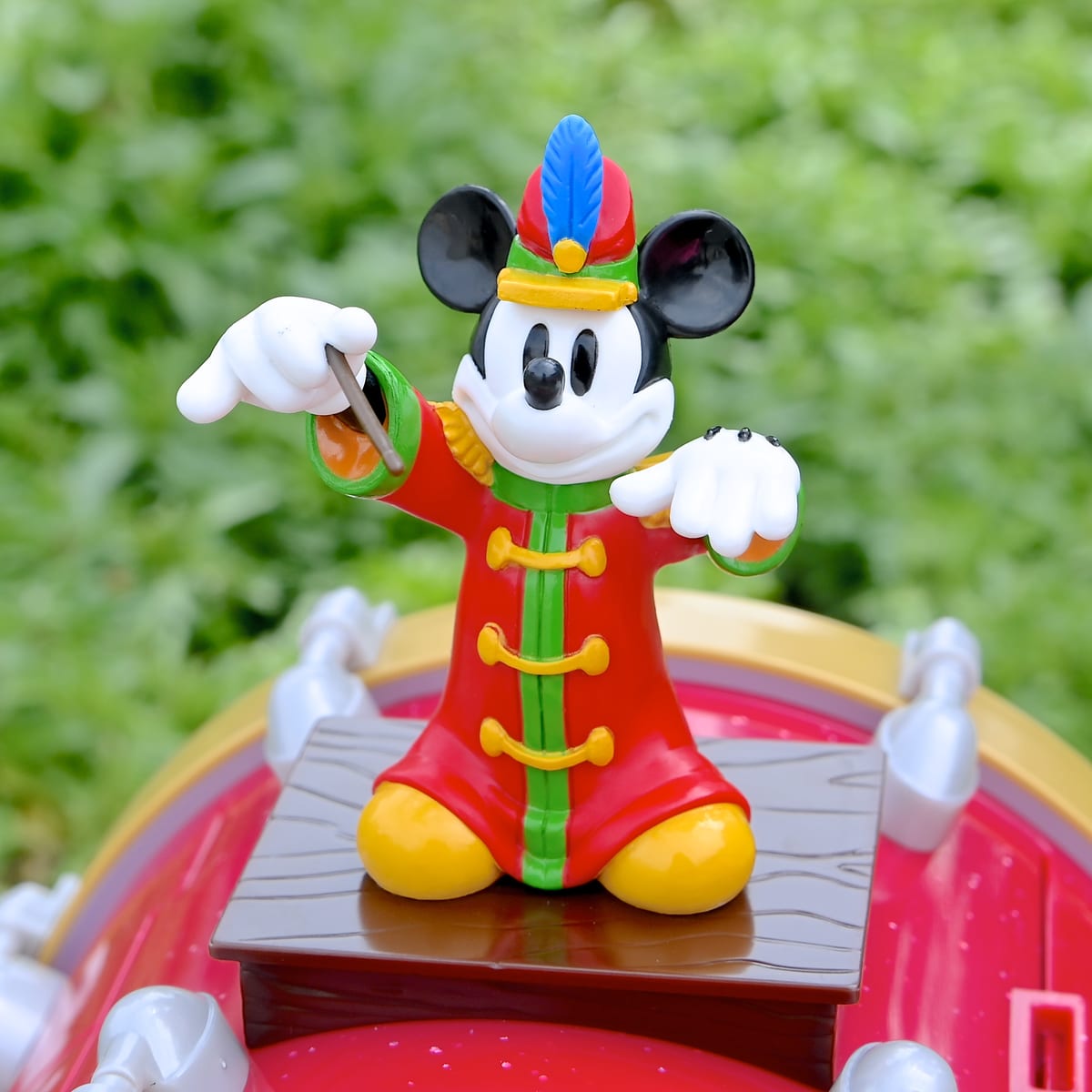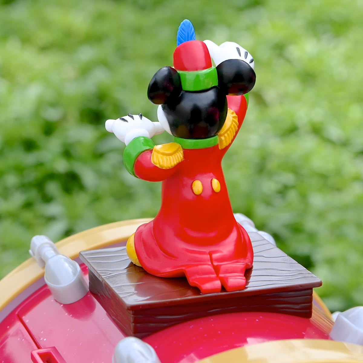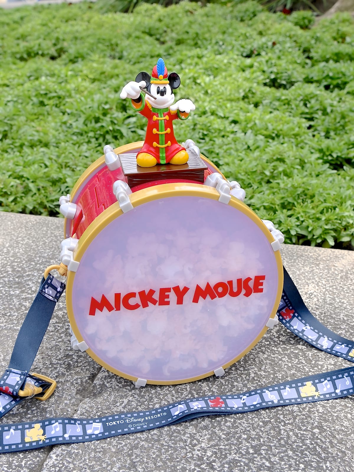 指揮者コスチュームのミッキーマウスのフィギュアが大きなドラムの上にのったポップコーンバケット。
