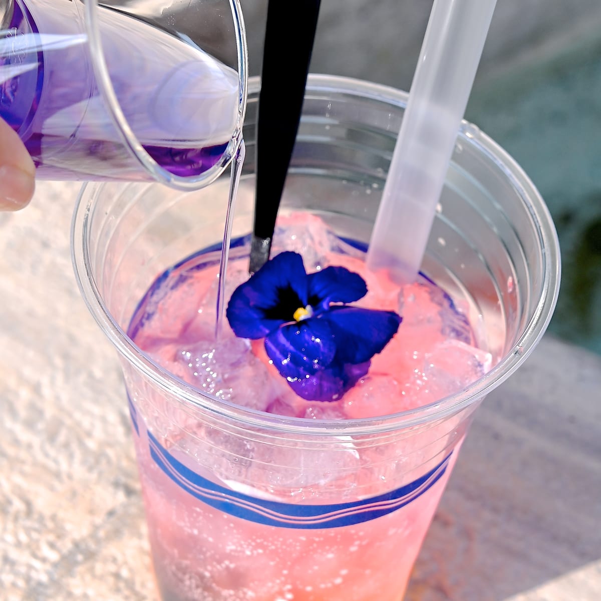 バタフライピー(ハーブ)のシロップを入れて色の変化も楽しめるカクテル。