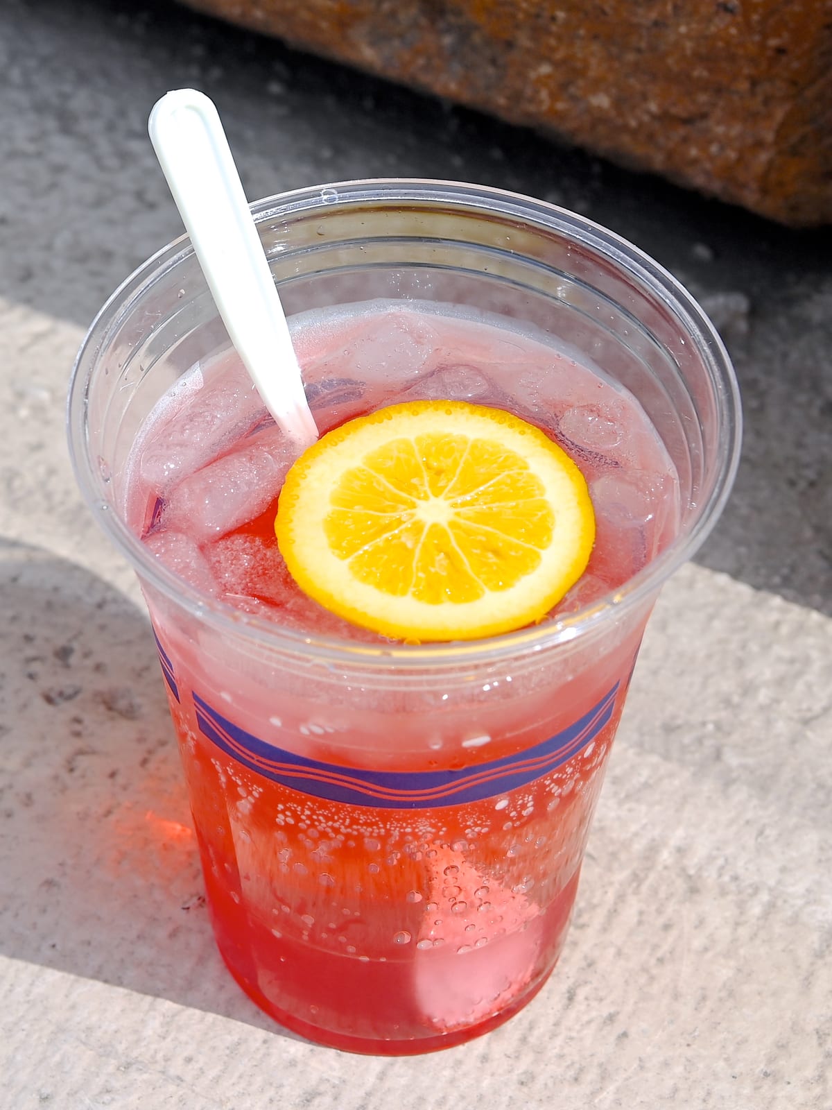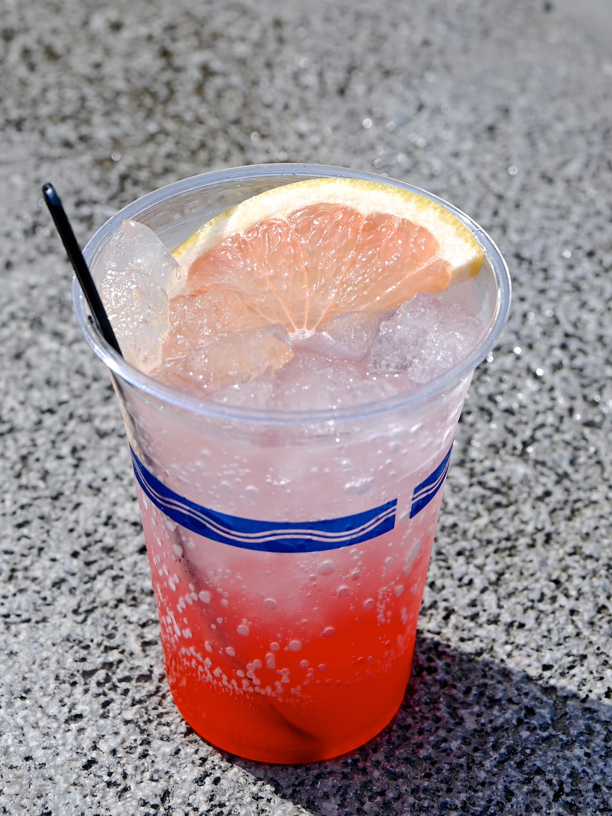 要塞の中庭にあるレストラン「リフレスコス」では爽やかなピンクグレープフルーツのハイボールを提供。