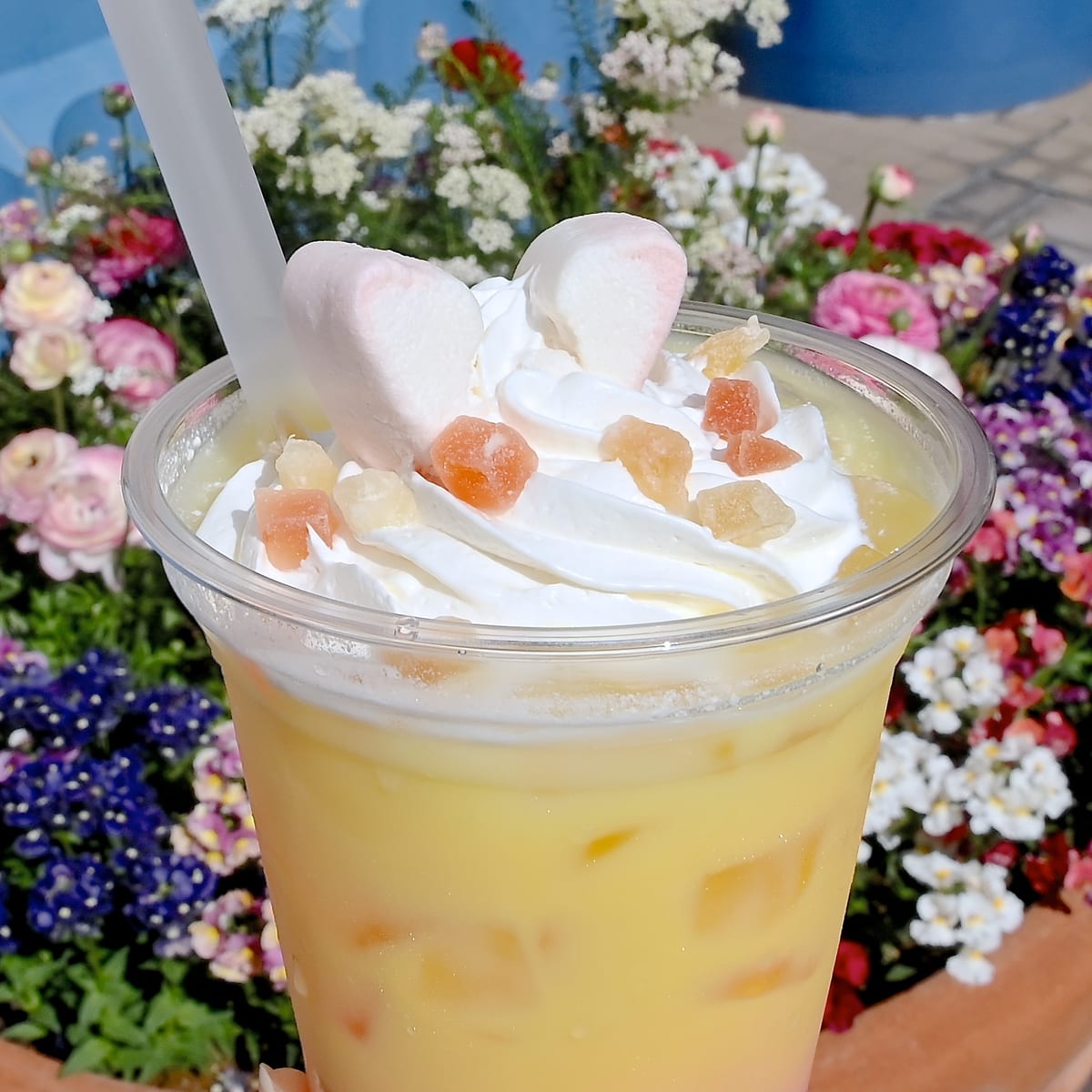 たっぷりのホイップクリーム、ドライフルーツ、うさ耳を再現したマシュマロがトッピングされています。