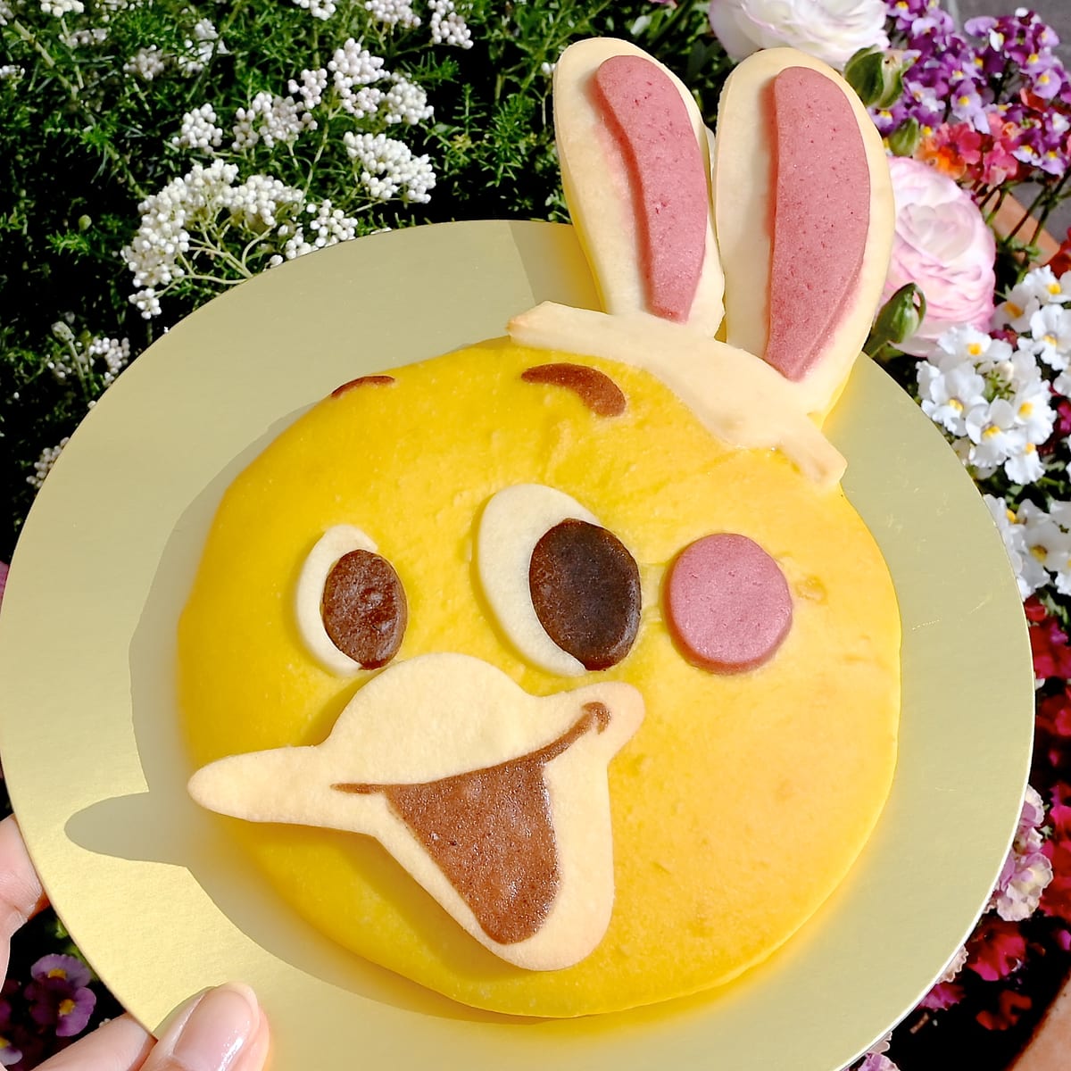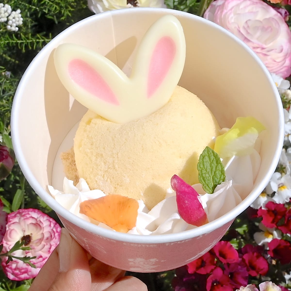 カスタードクリーム入りのふんわり蒸しパンに、うさ耳チョコレート、ホイップクリーム、春をイメージしたお花など散りばめられています。