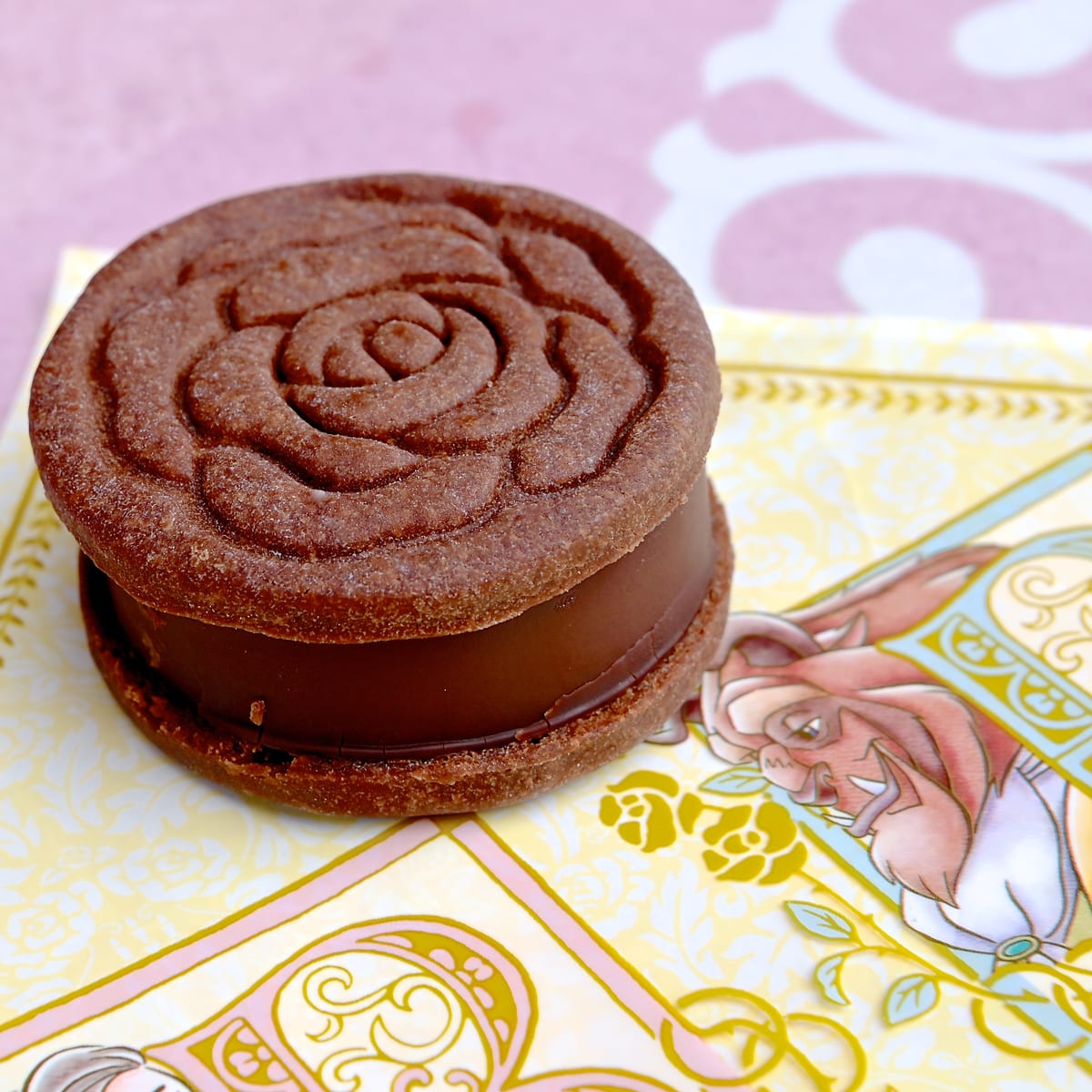 『美女と野獣』のキーアイテムであるバラをデザインしたキャラメル・ガナッシュクッキーサンド。