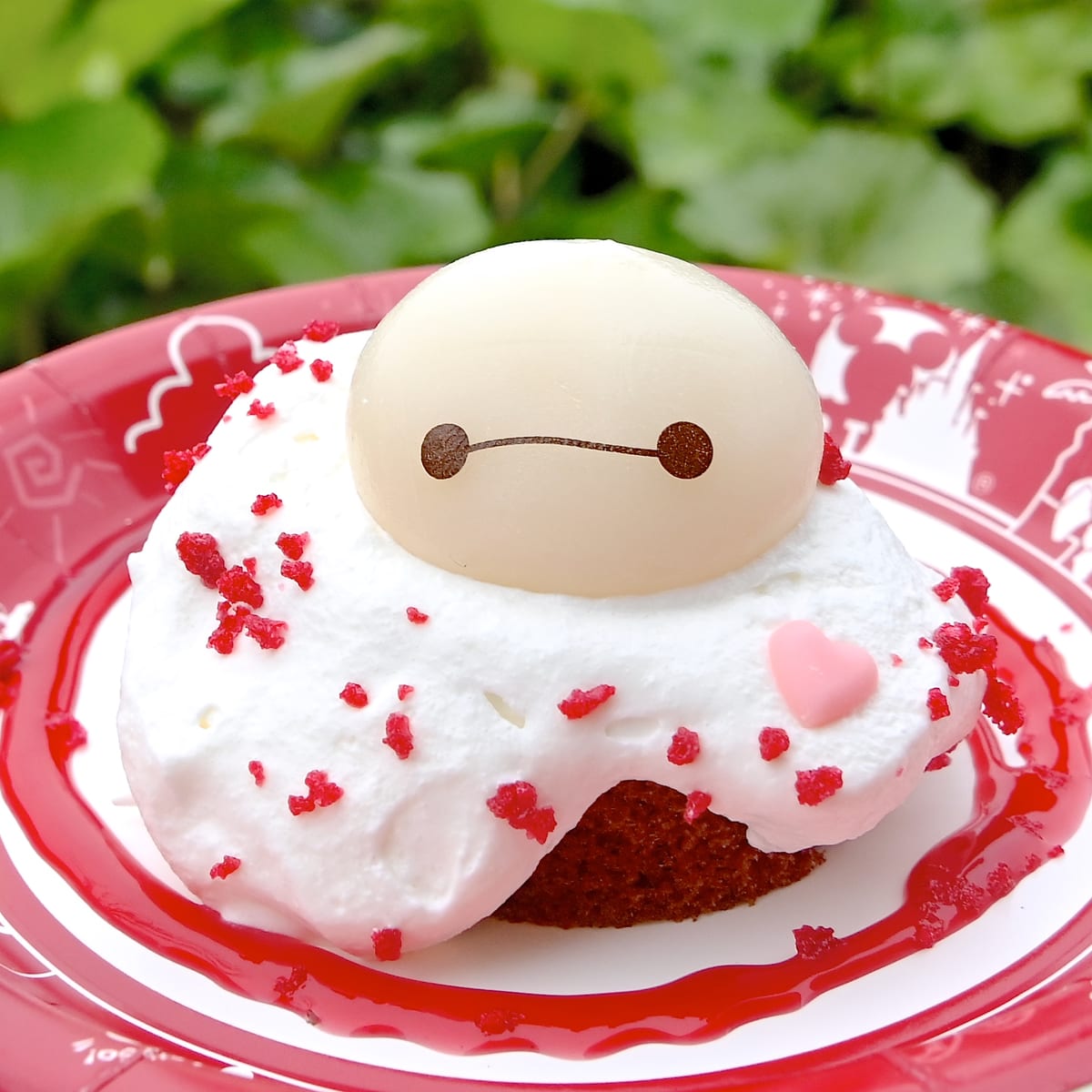 ふんわり食感のチョコロールケーキにふわふわなホイップクリーム、ストロベリーの顆粒、カスタードクリーム入りのベイマックスもち、ハートのチョコレートがトッピングされています!