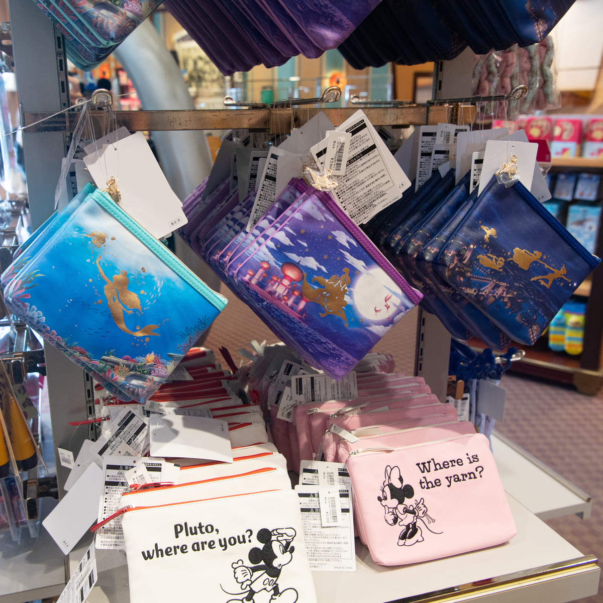 東京ディズニーランド、東京ディズニーシーではディズニーキャラクターデザインのポーチを種類豊富に販売中!