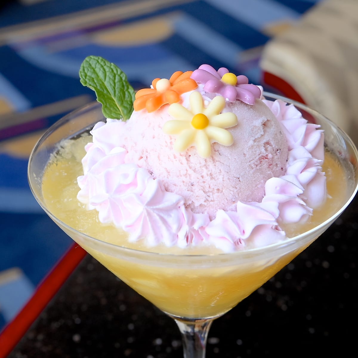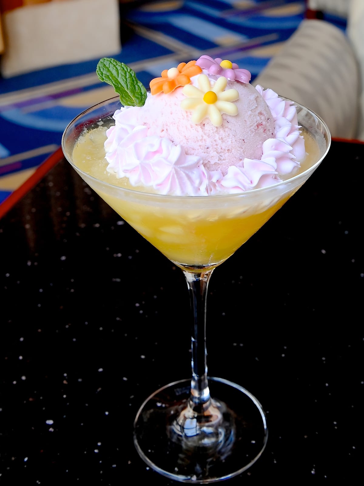 レモネード、オレンジジュース、ピーチシロップ入りの春らしいドリンクに、ストロベリーアイスクリーム、レモンクラッシュアイス、ストロベリーホイップクリーム、お花のチョコレート、ミントがトッピングされたラプンツェルモチーフのフロートです。