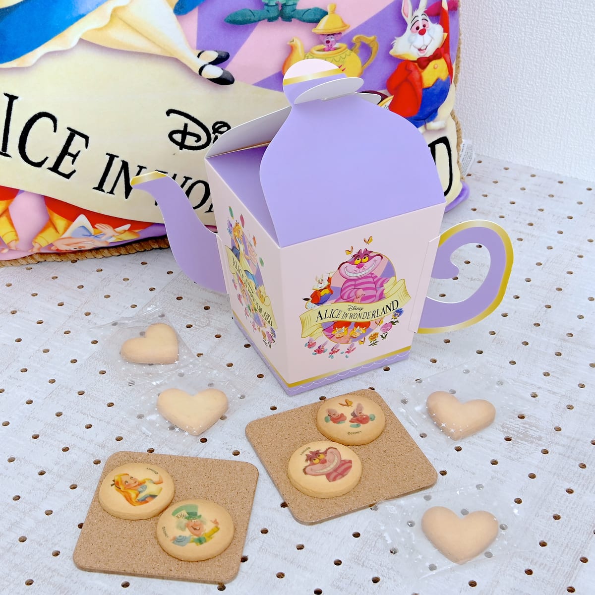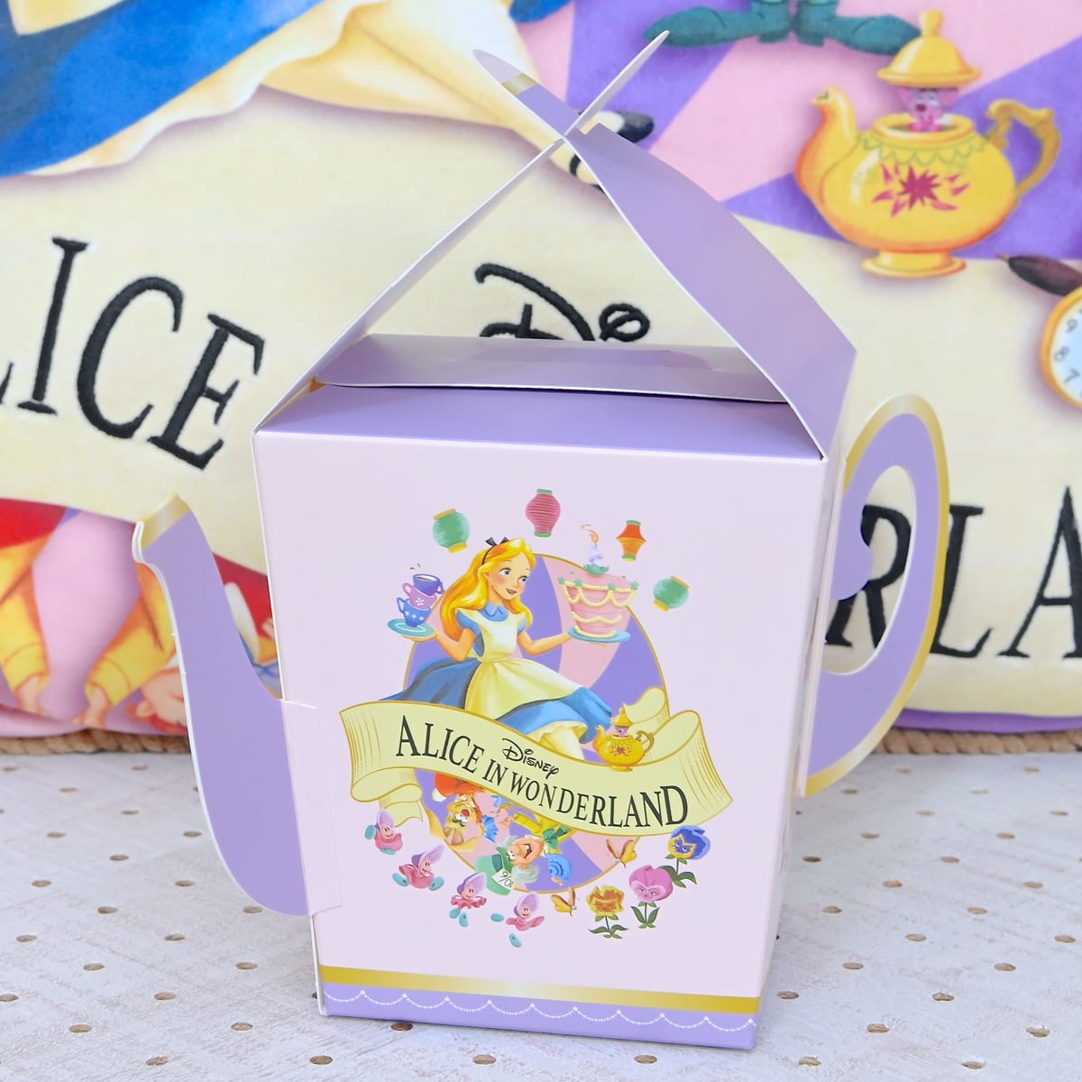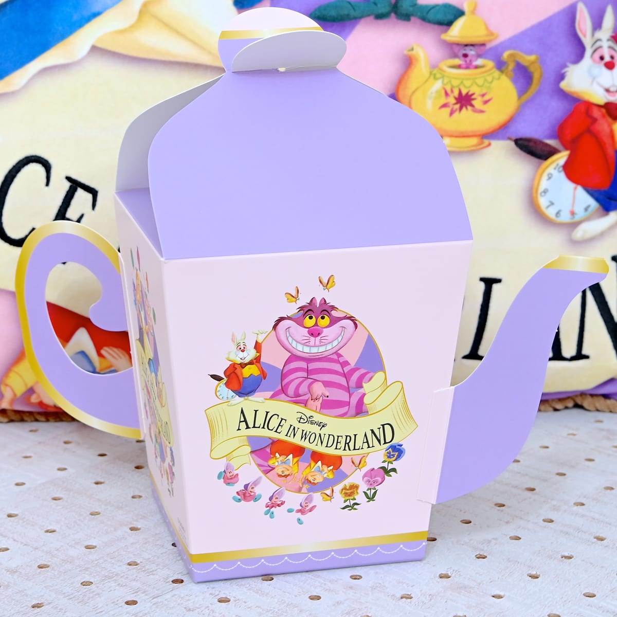 アリスやヤングオイスター、チェシャ猫たちがデザインされたティーポット型のボックスに入ったクッキー。