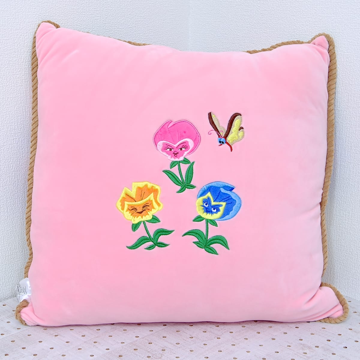 バックは、パンとバターフライ、カラフルな花たちの刺繍デザイン。