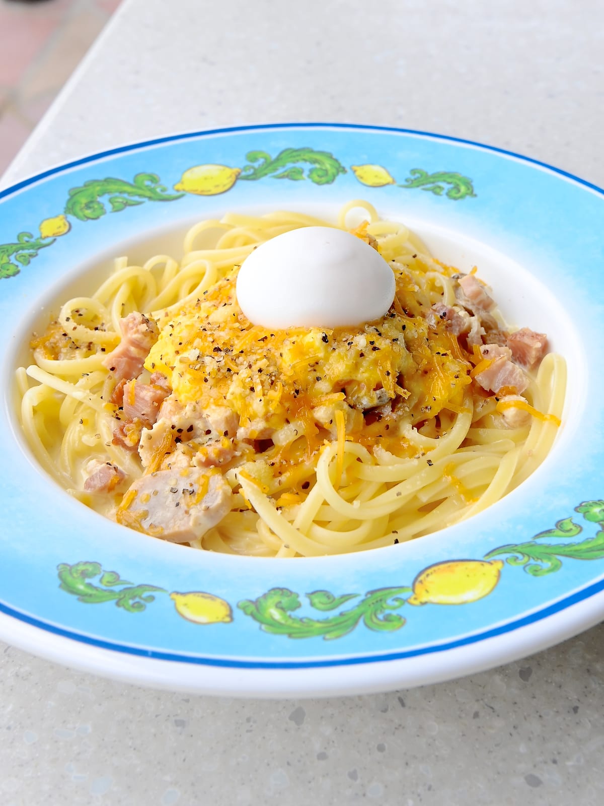 パスタは、たまごがトッピングされた色鮮やかなカルボナーラ。