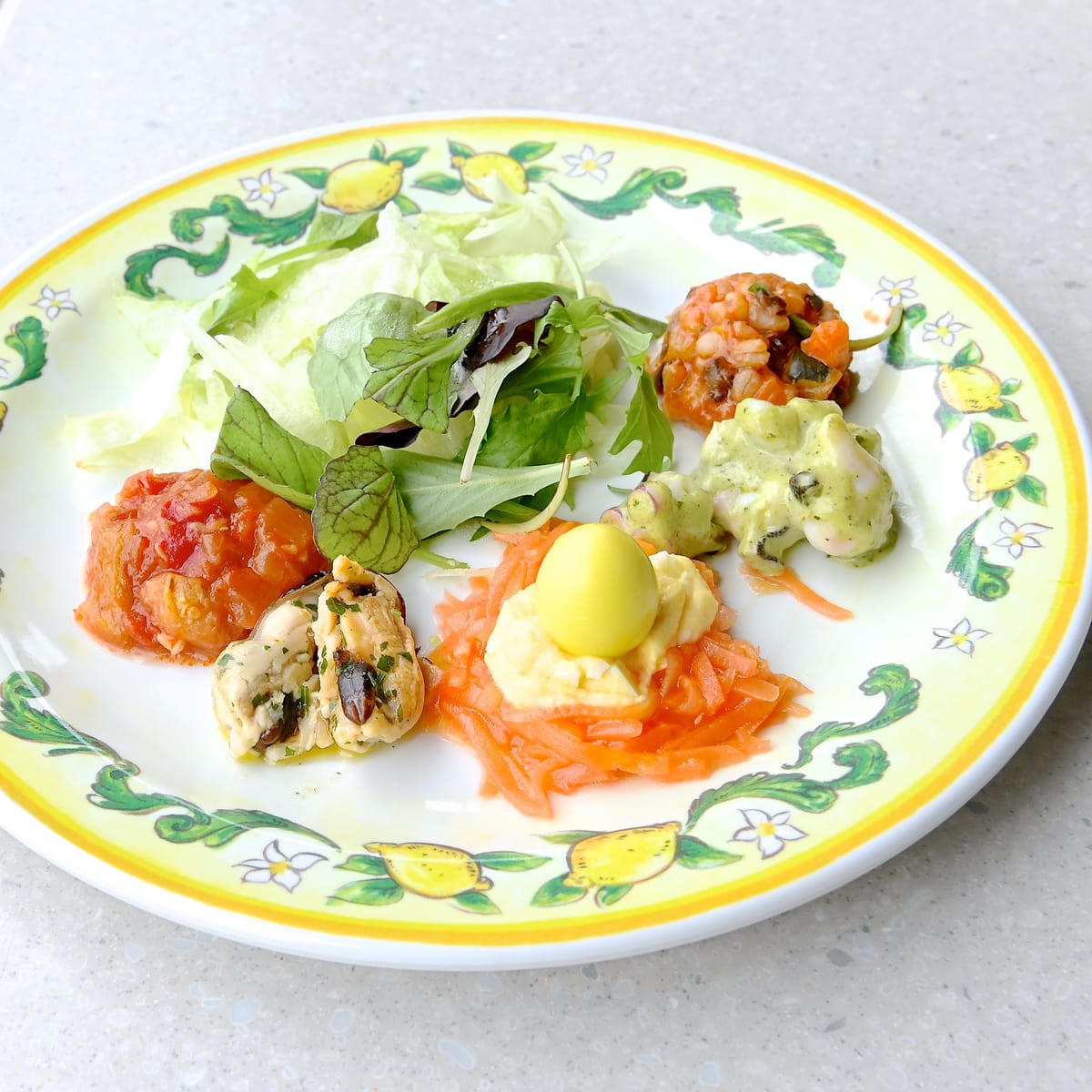 キャロットマリネとエッグサラダ、ムール貝、タコとイカのバジルマヨネーズ、大麦のサラダ、ラタトゥイユ、さっぱりしたサラダの盛り合わせになっています。