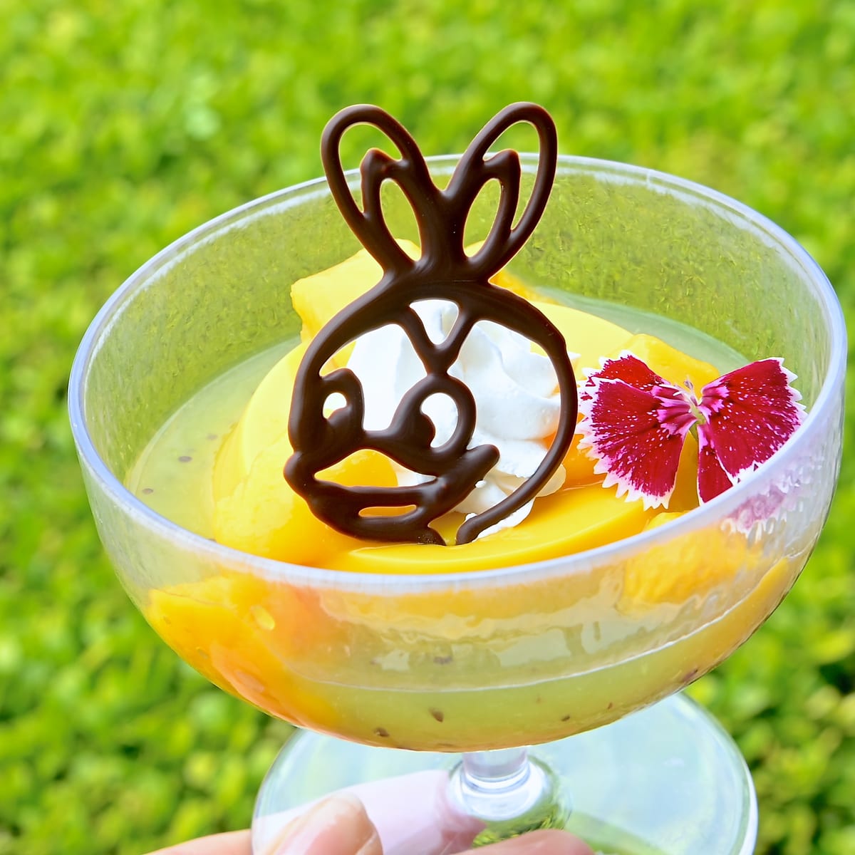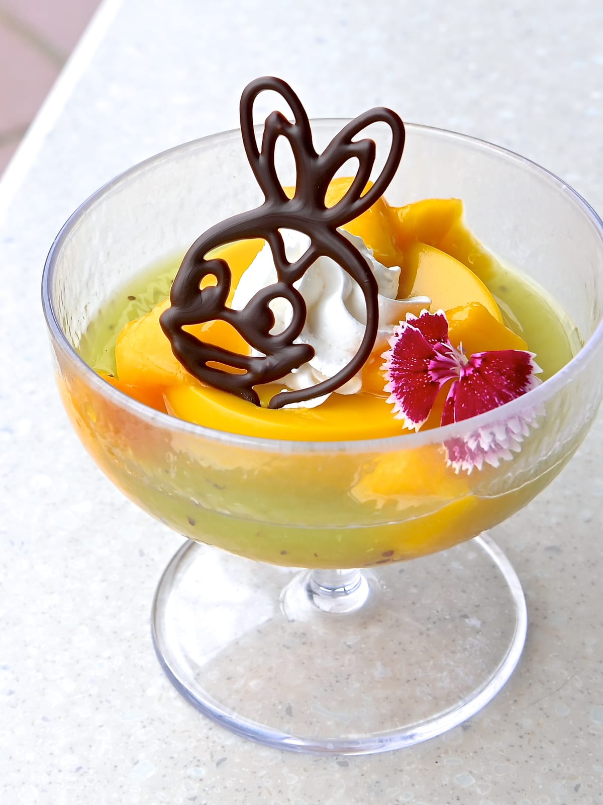 濃厚なマンゴープリン、キウイソース、マンゴー、ホイップクリームにうさピヨのお顔型チョコレートがトッピングされています。