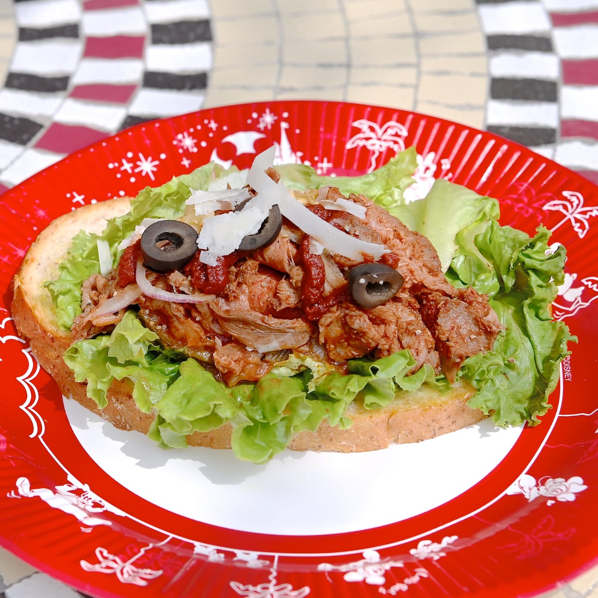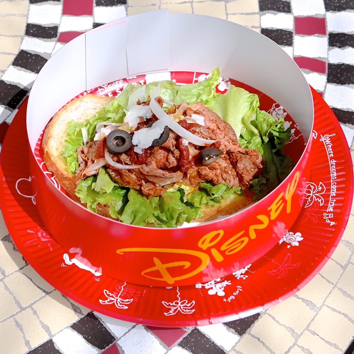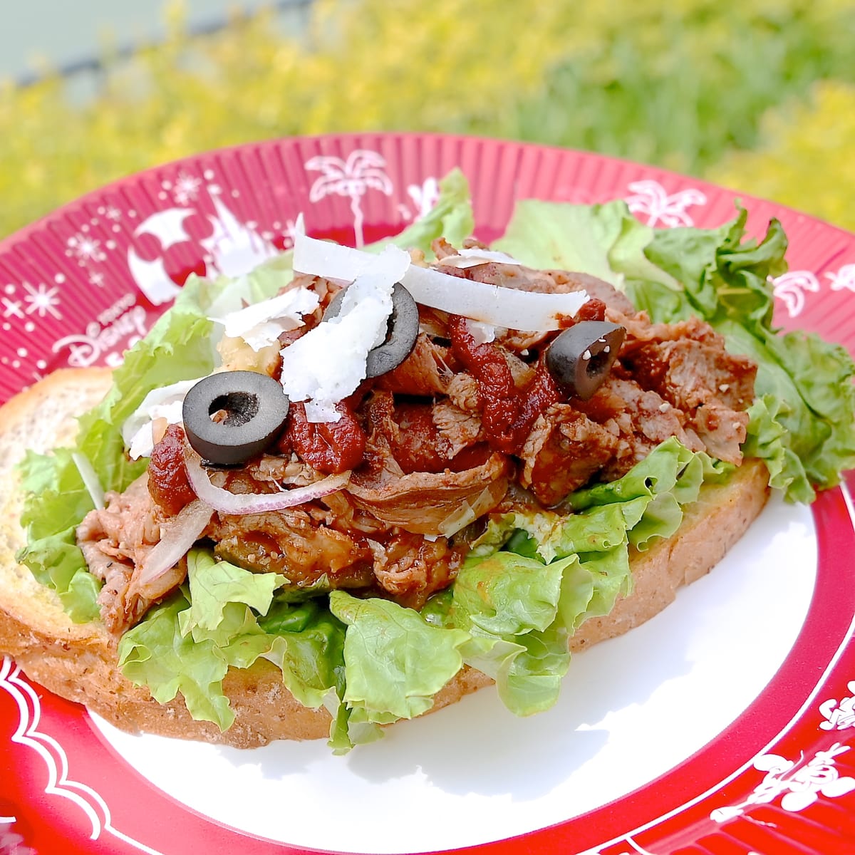 タルタルソースの上にたっぷりのレタス、ローストビーフとタマネギ、ブラックオリーブ、チーズ、クルミをトッピング。