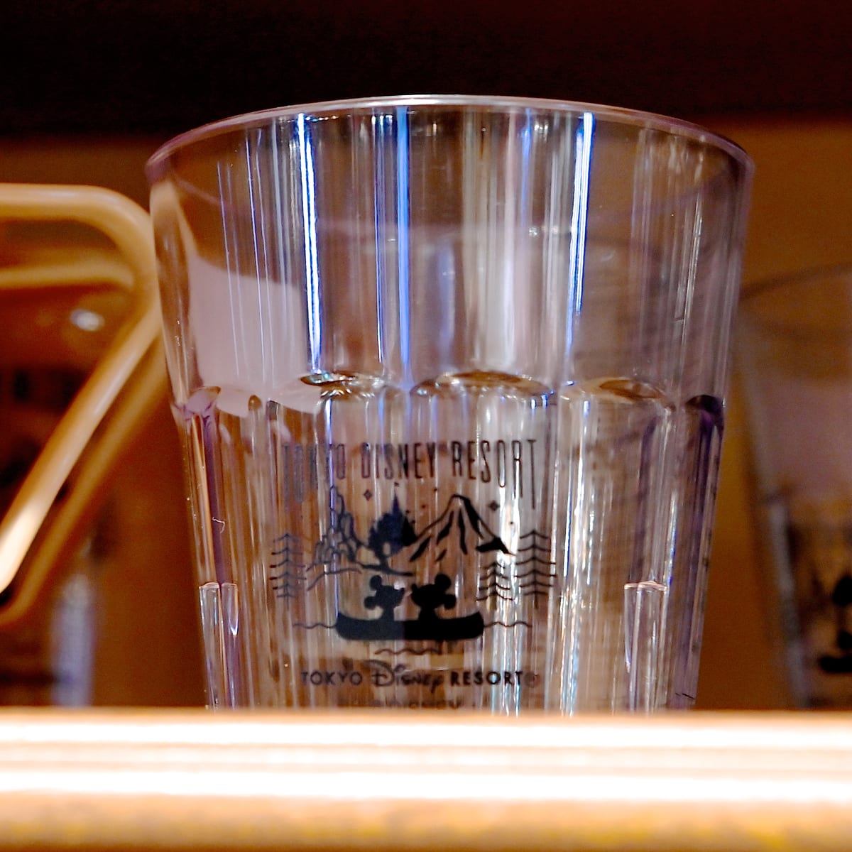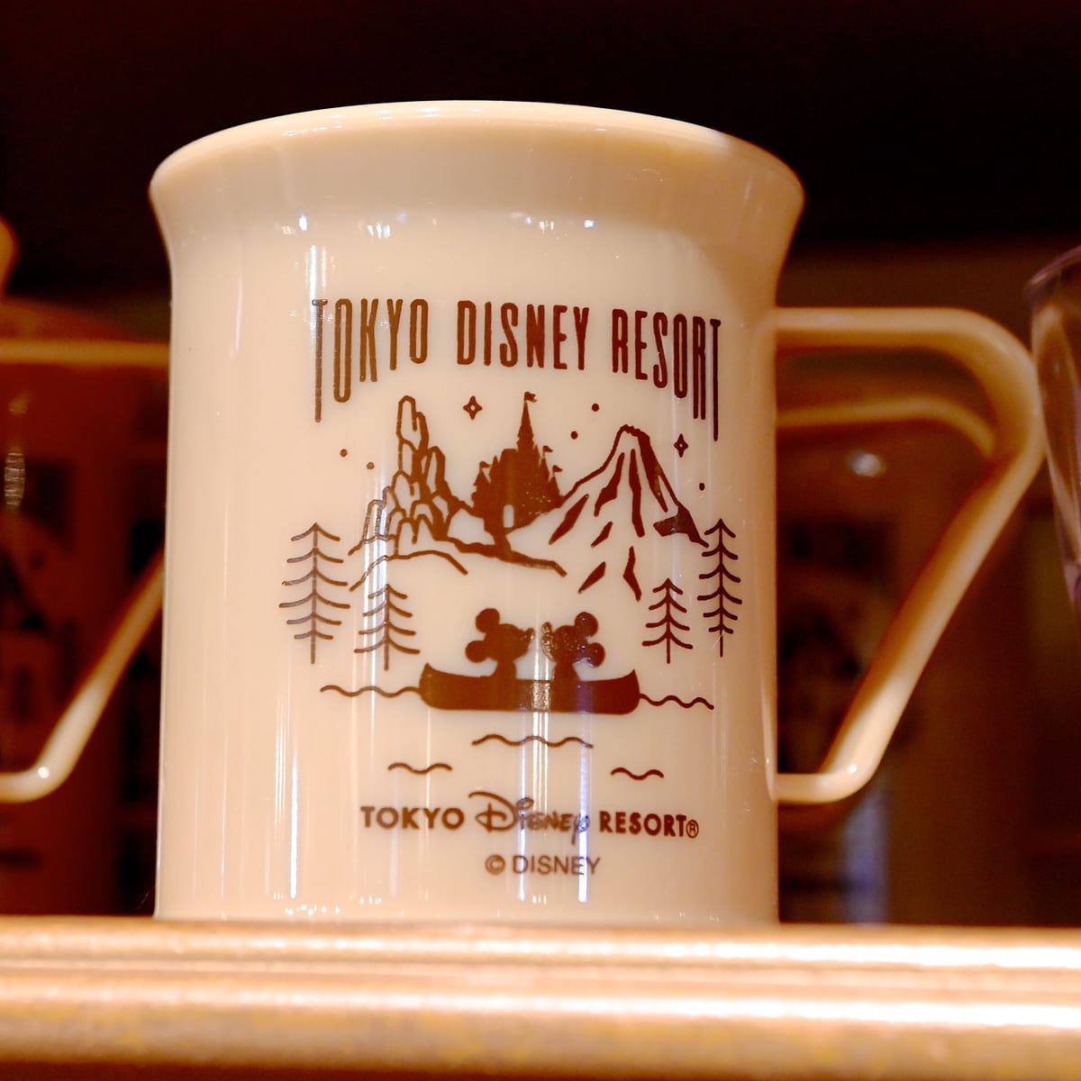 東京ディズニーリゾートのロゴ、シンデレラ城、船にのるミッキー&ミニーのシルエットがデザインされたアウトドアな雰囲気のマグカップ。
