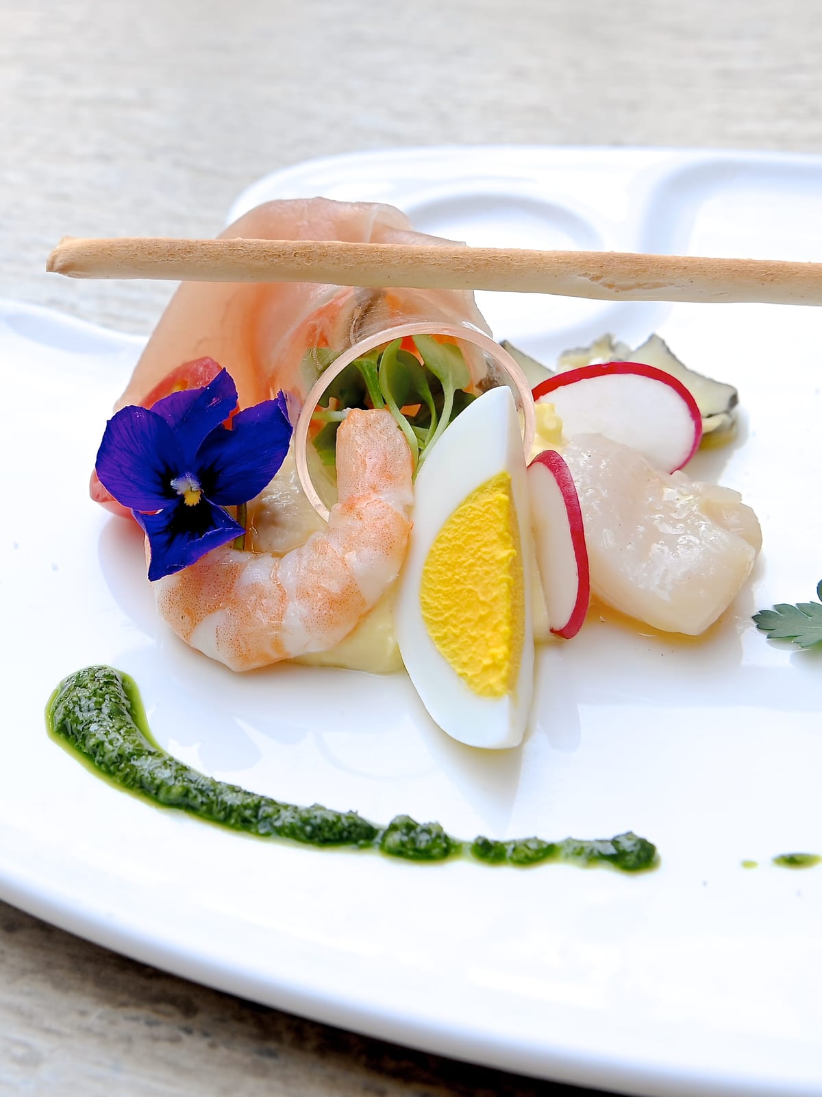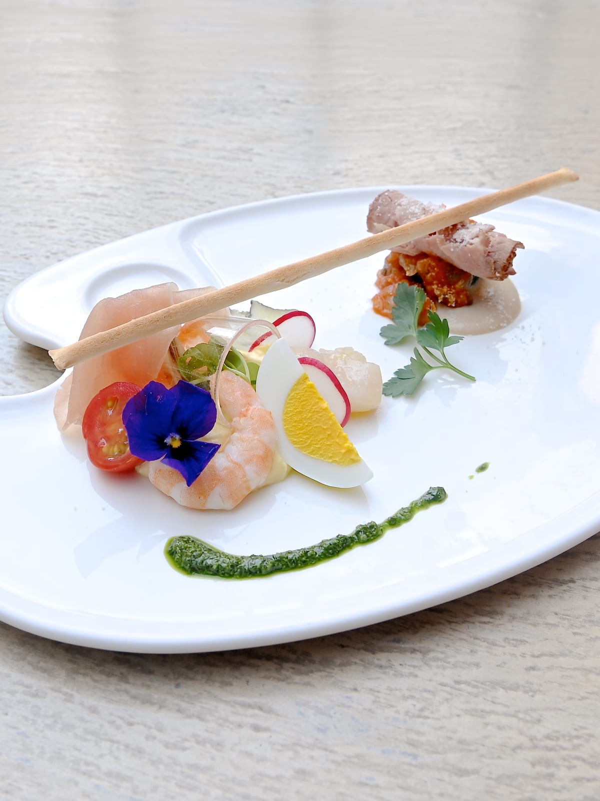 シーフードとエッグのサラダ、生ハムとグリッシーニ、