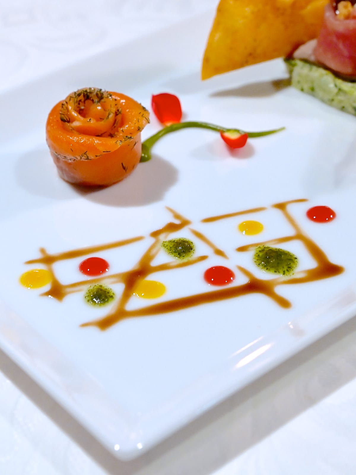 ソース(バルサミコ、バジル、オレンジ、フランボワーズ)で描かれたステンドグラス、美しいバラはディルでマリネされたサーモントラウト、