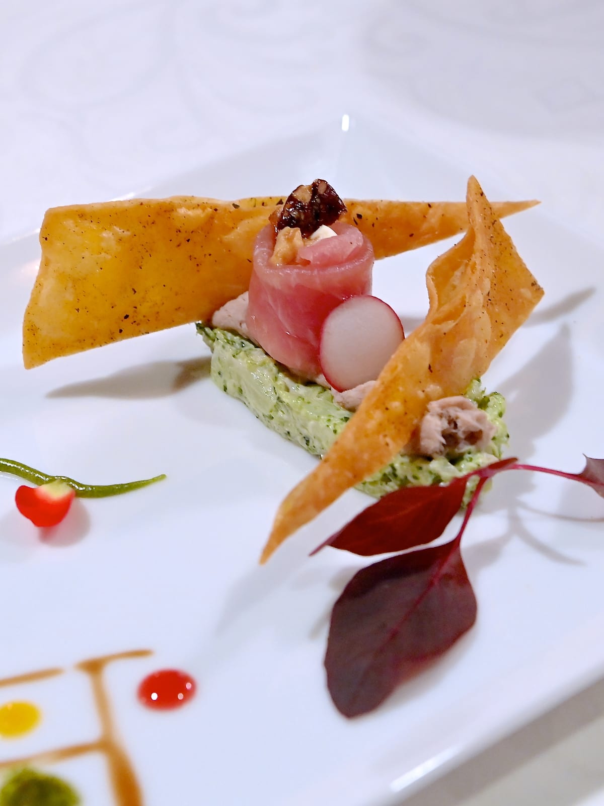 ビーフムースとケイジャントルティーヤ、 生ハムとクリームチーズのナッツ添え