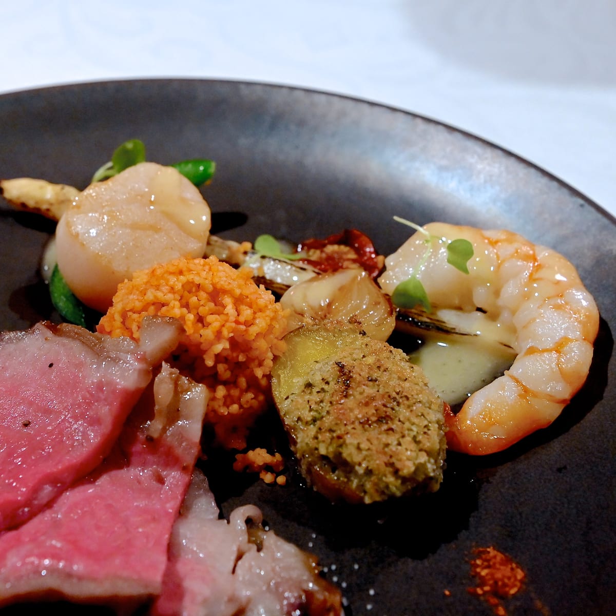 豪華な付け合せは海老、ホタテ、ホワイトアスパラガスやスナップエンドウ、クスクス、インカのめざめ。