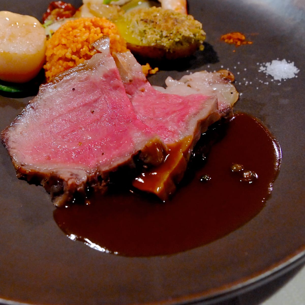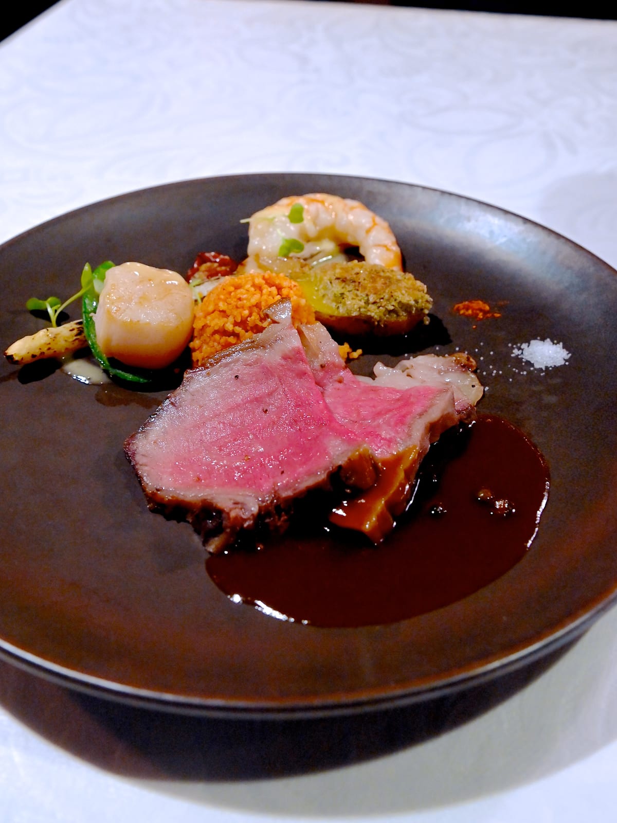 メインは、「ローストビーフのグリーン、ペッパーソース 海老、帆立貝、ホワイトアスパラガス添え」