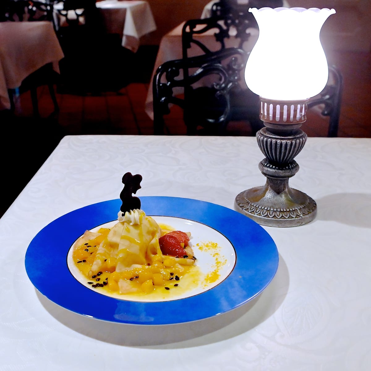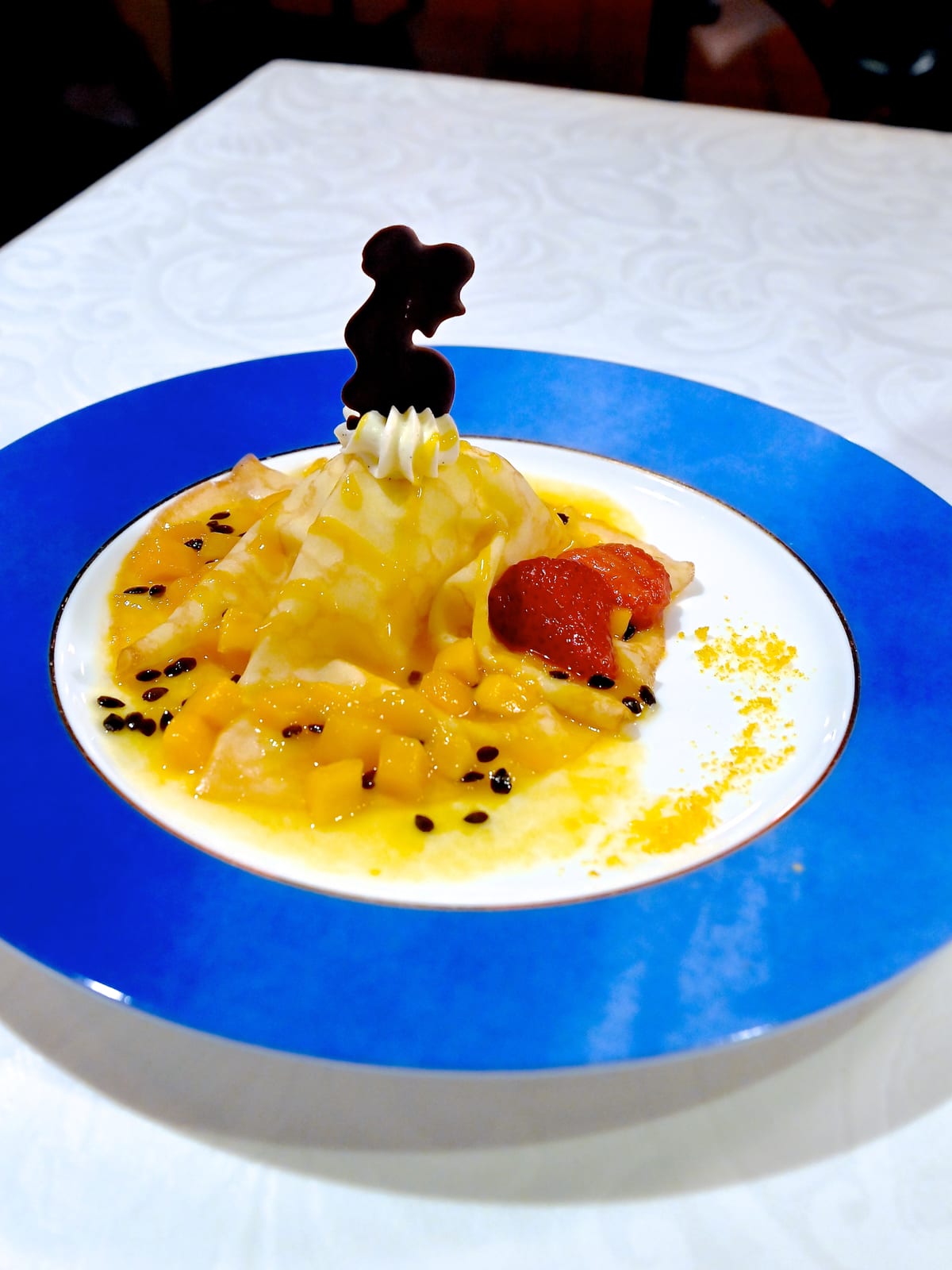 デザートはパッションフルーツムースとマスカルポーネクリームのクレープ。