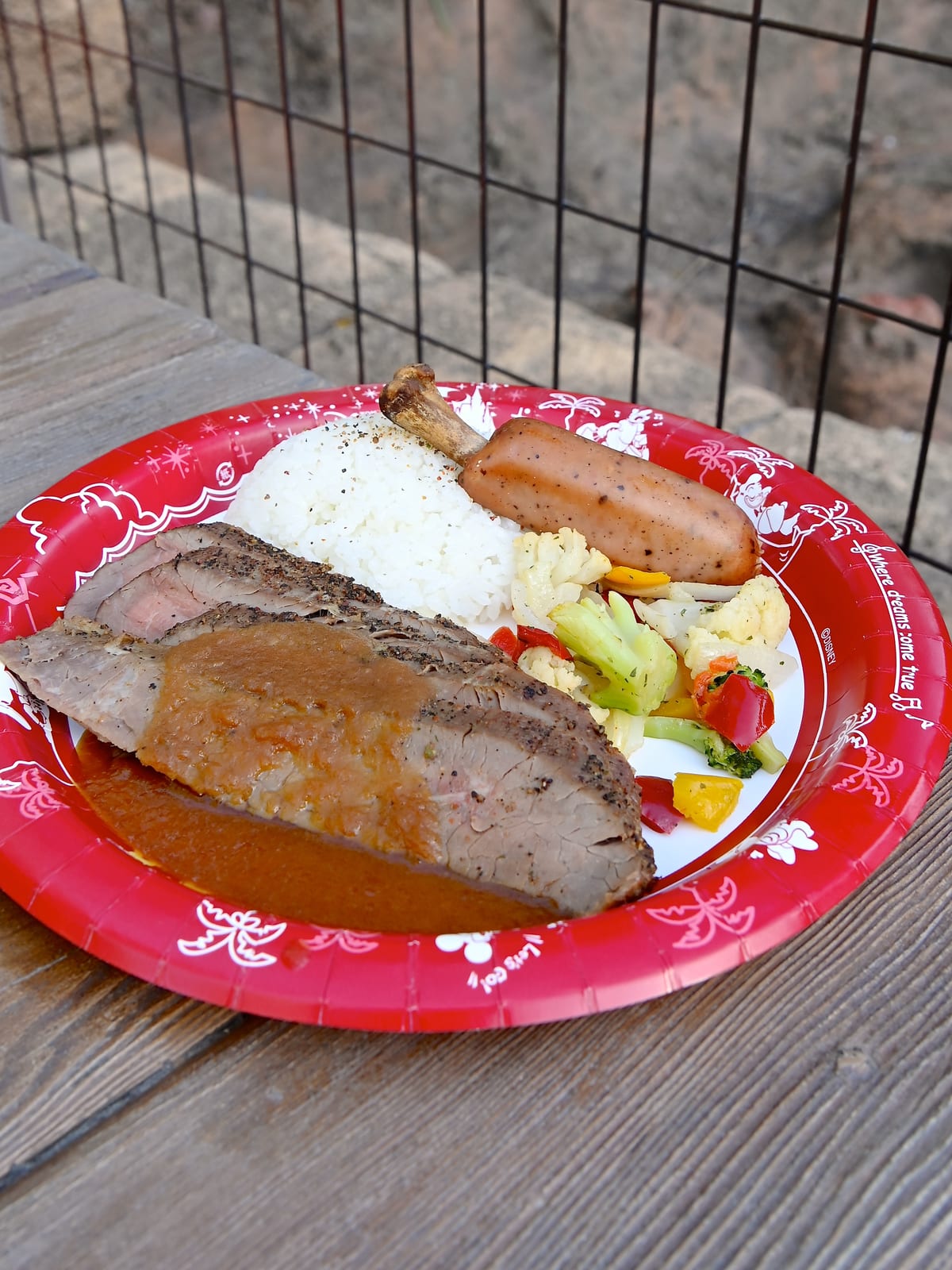 メインはローストビーフ和風ソース、骨付きソーセージ、ライス添え。