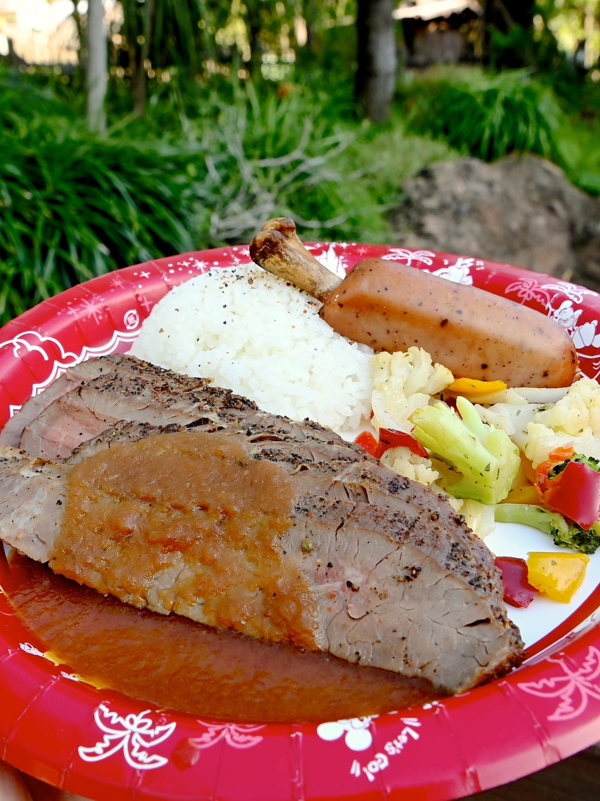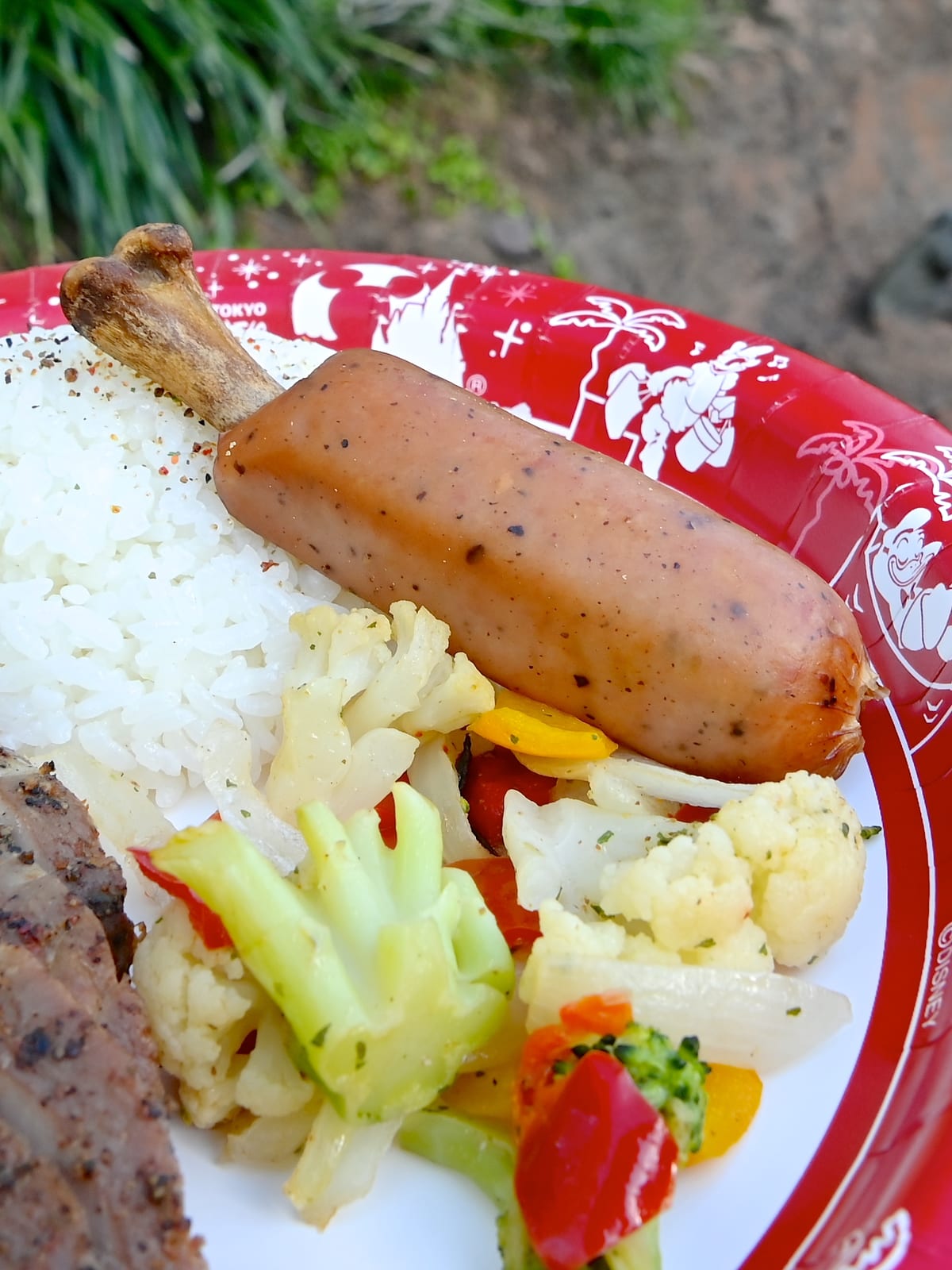 ローストビーフ 和風ソース、骨付きソーセージ、ライス添え