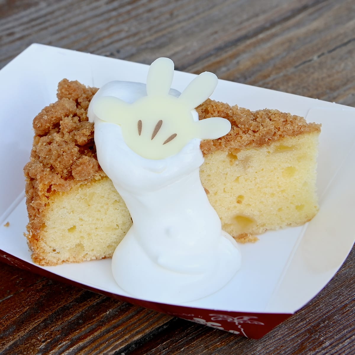サクサク食感&しっとりしたケーキに、ふんわりホイップクリームとホワイトチョコレートのミッキーグローブがトッピングされています☆