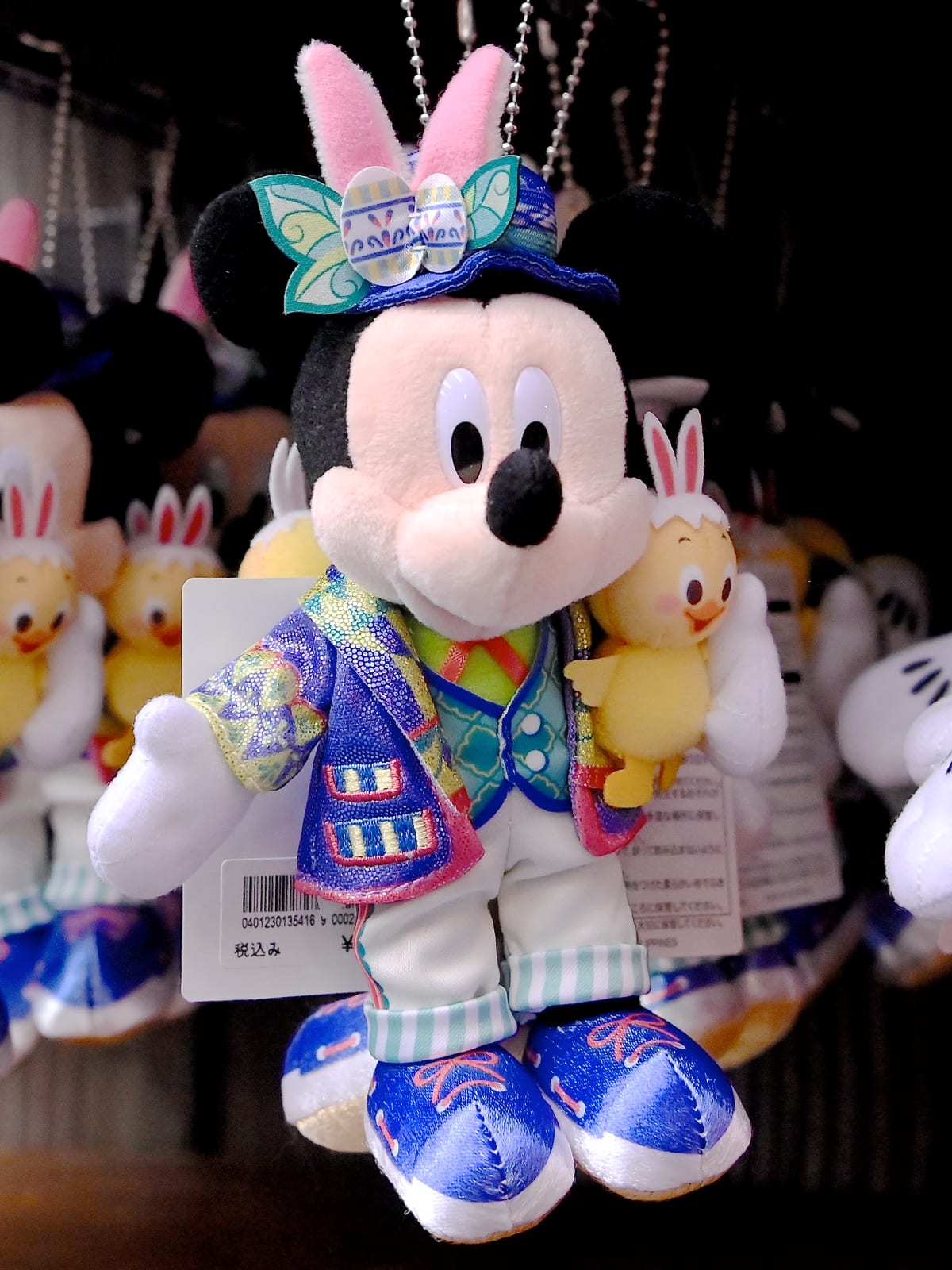 「Tip-Topイースター」のうさ耳やイースターエッグデザインのコスチュームを着たミッキーマウスのぬいぐるみバッジ。