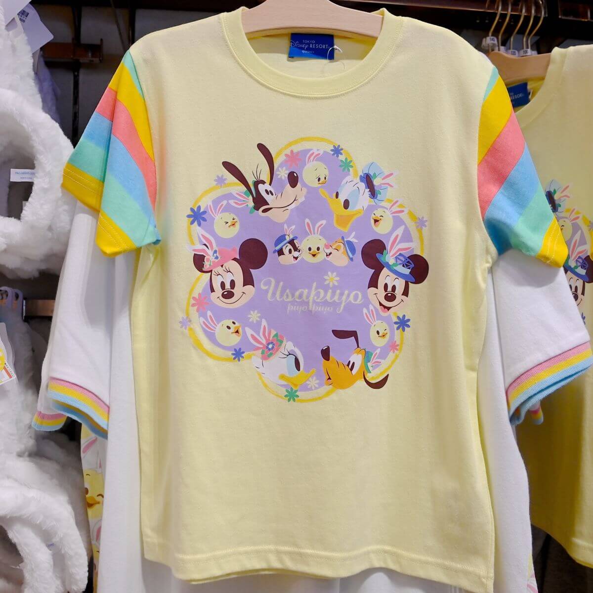 イースターコスチュームのミッキーマウス、ミニーマウス、プルート、ドナルドダック、デイジーダック、グーフィー、チップ&デール、うさピヨたちがデザインされたTシャツ。