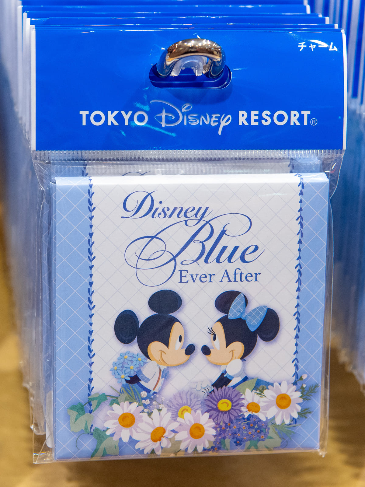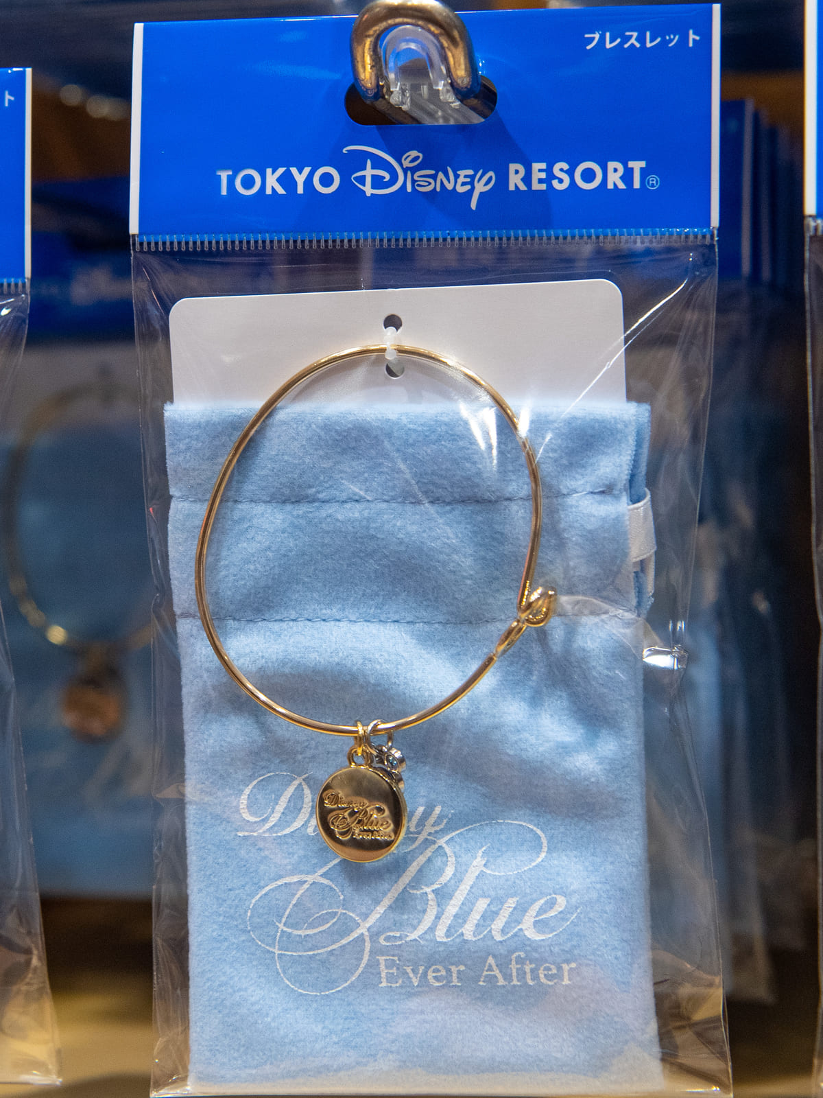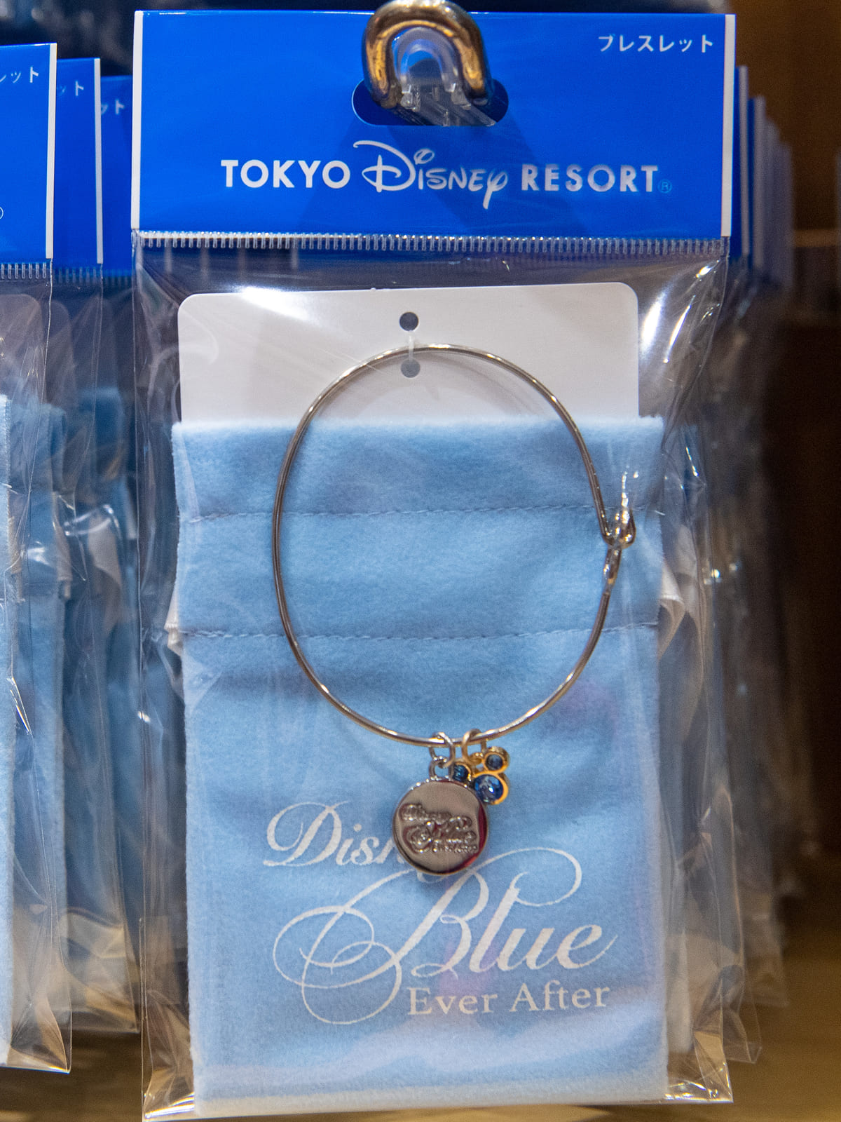 ミッキーシェイプのブルーのラインストーンと、「Disney Blue Ever After」のロゴが刻印されたシルバーカラーのチャームがついています。