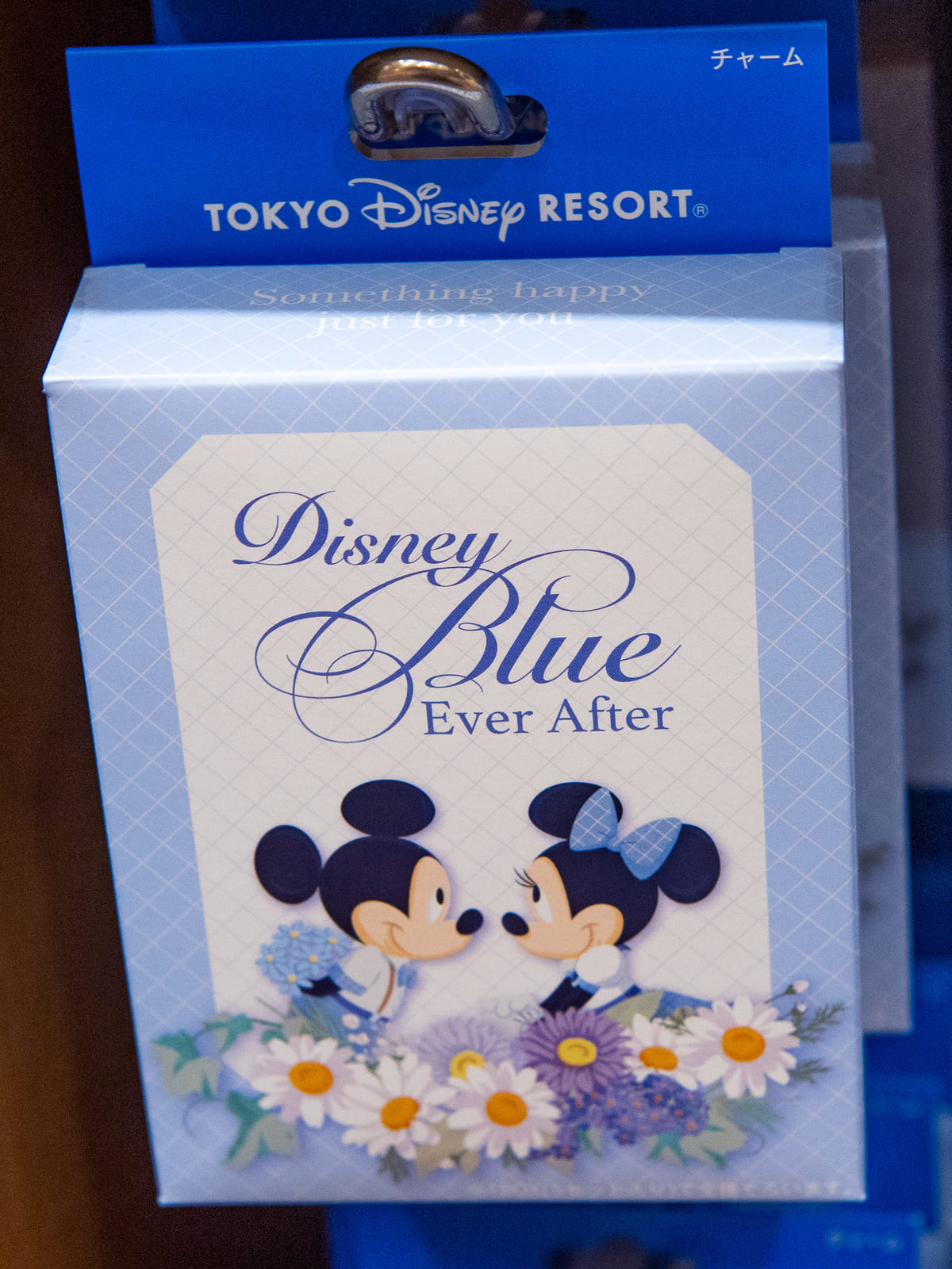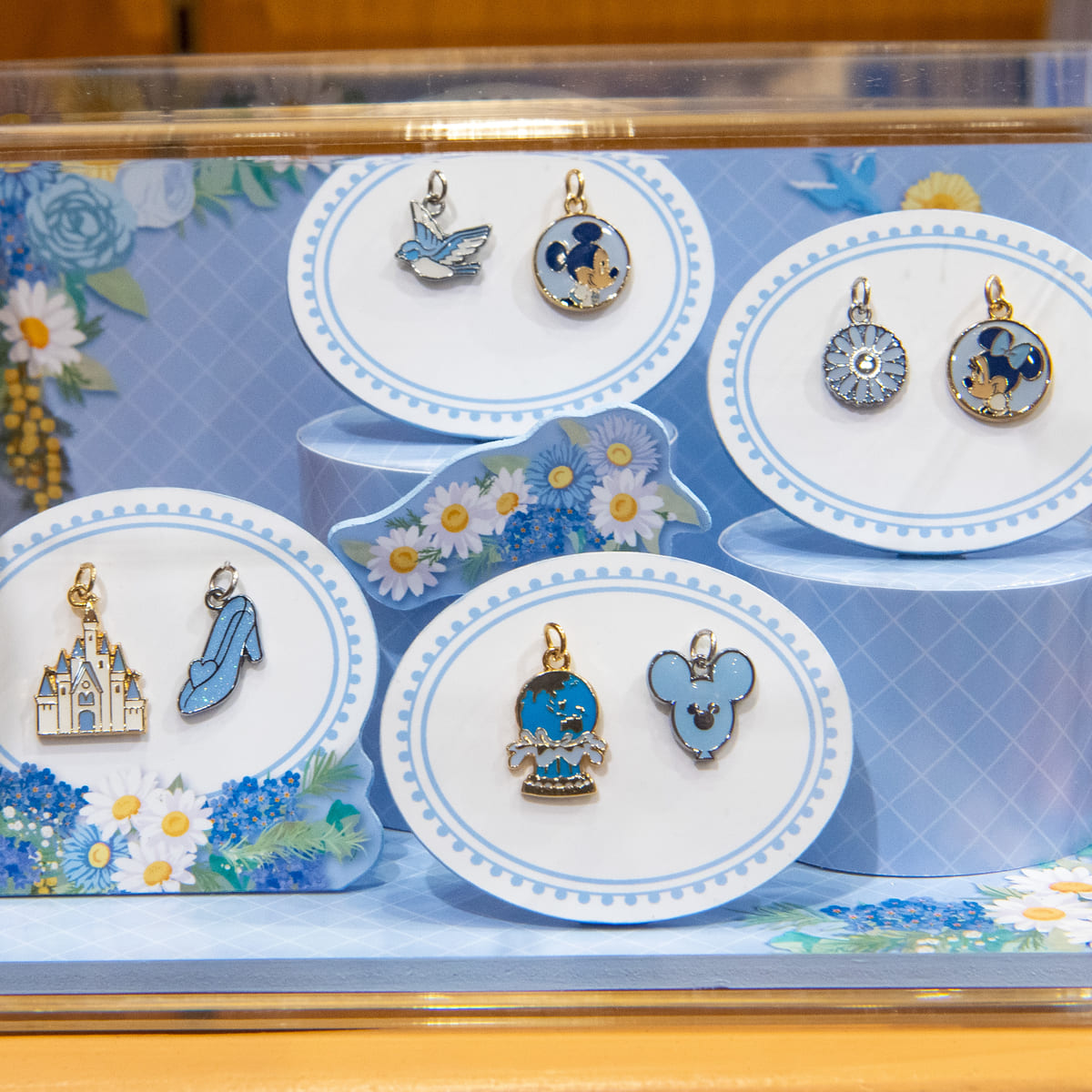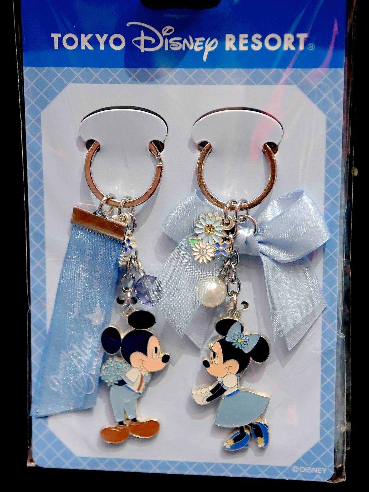ミッキーシェイプのブルーのラインストーンと、「Disney Blue Ever After」のロゴが刻印されたシルバーカラーのチャームがついています。