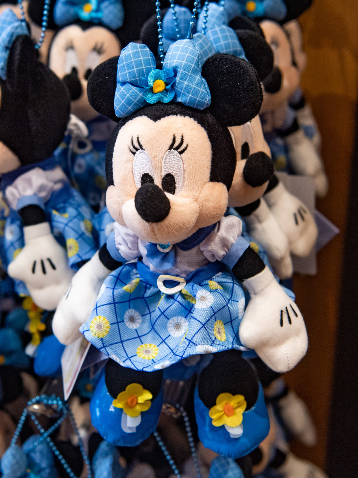 リボンやワンピース、靴にもガーベラの模様があしらわれたブルーのコスチュームがかわいい「ミニーマウス」のぬいぐるみバッジ。