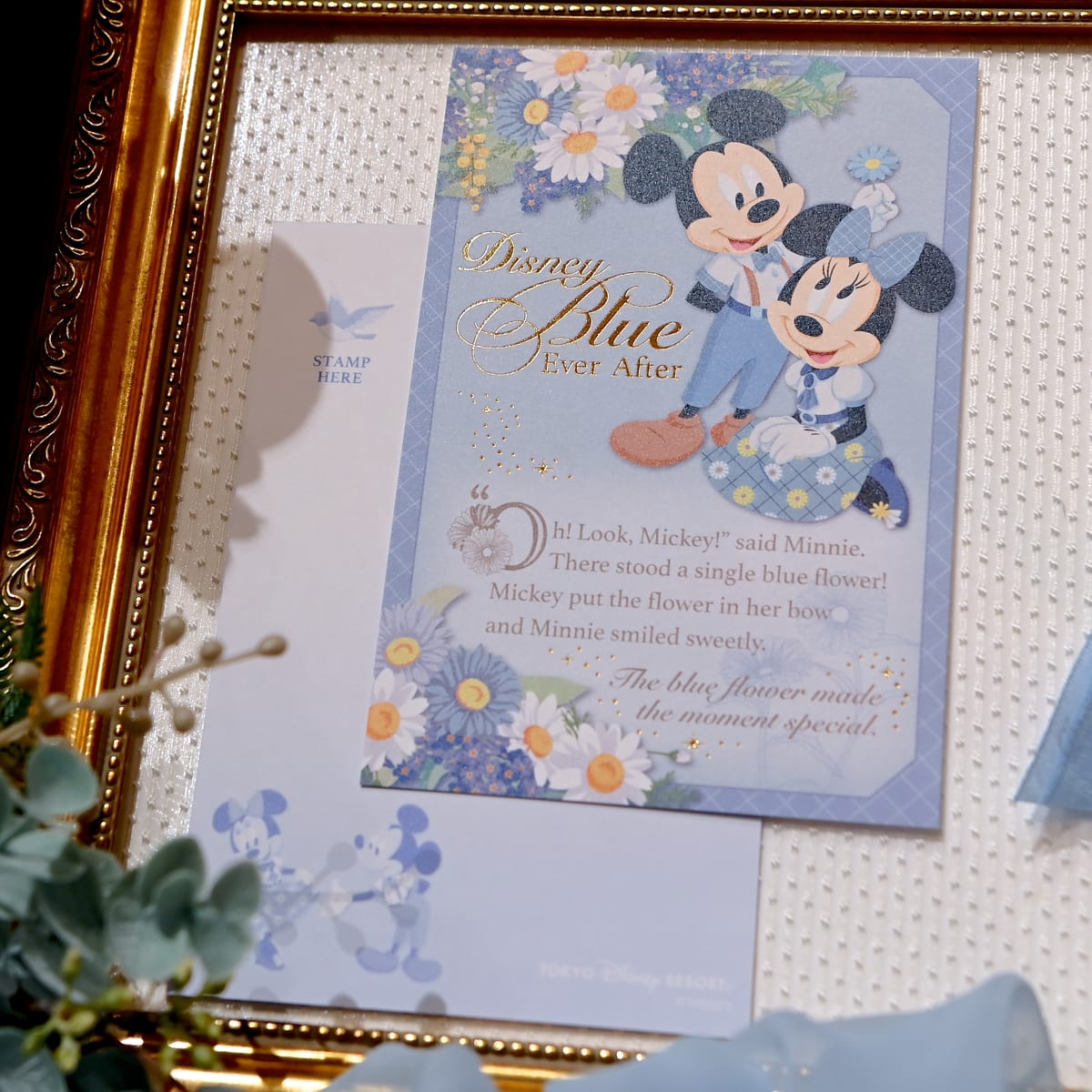 「Disney Blue Ever After」のロゴが金色の箔押し加工されているポストカード。